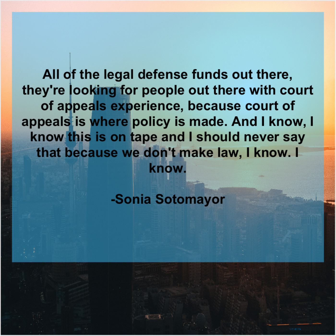 “All of the legal defense funds out there, they’re looking for people out there with court of appeals experience, because court of appeals is where policy is made. And I know, I know this is on tape and I should never say that because we don’t make law, I know. I know.”