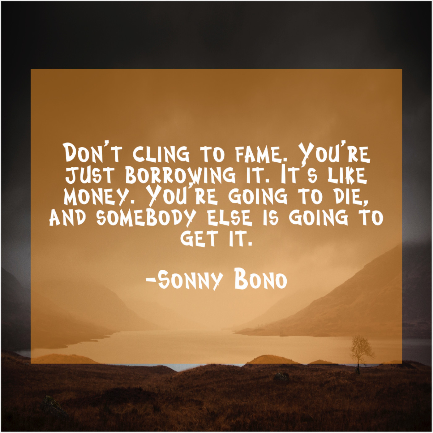 Sonny Bono Sonny Bono – Don’t cling to fame. You’re… October 17, 2019 admin “Don’t cling to fame. You’re just borrowing it. It’s like money. You’re going to die, and somebody else is going to get it.”-Sonny Bono