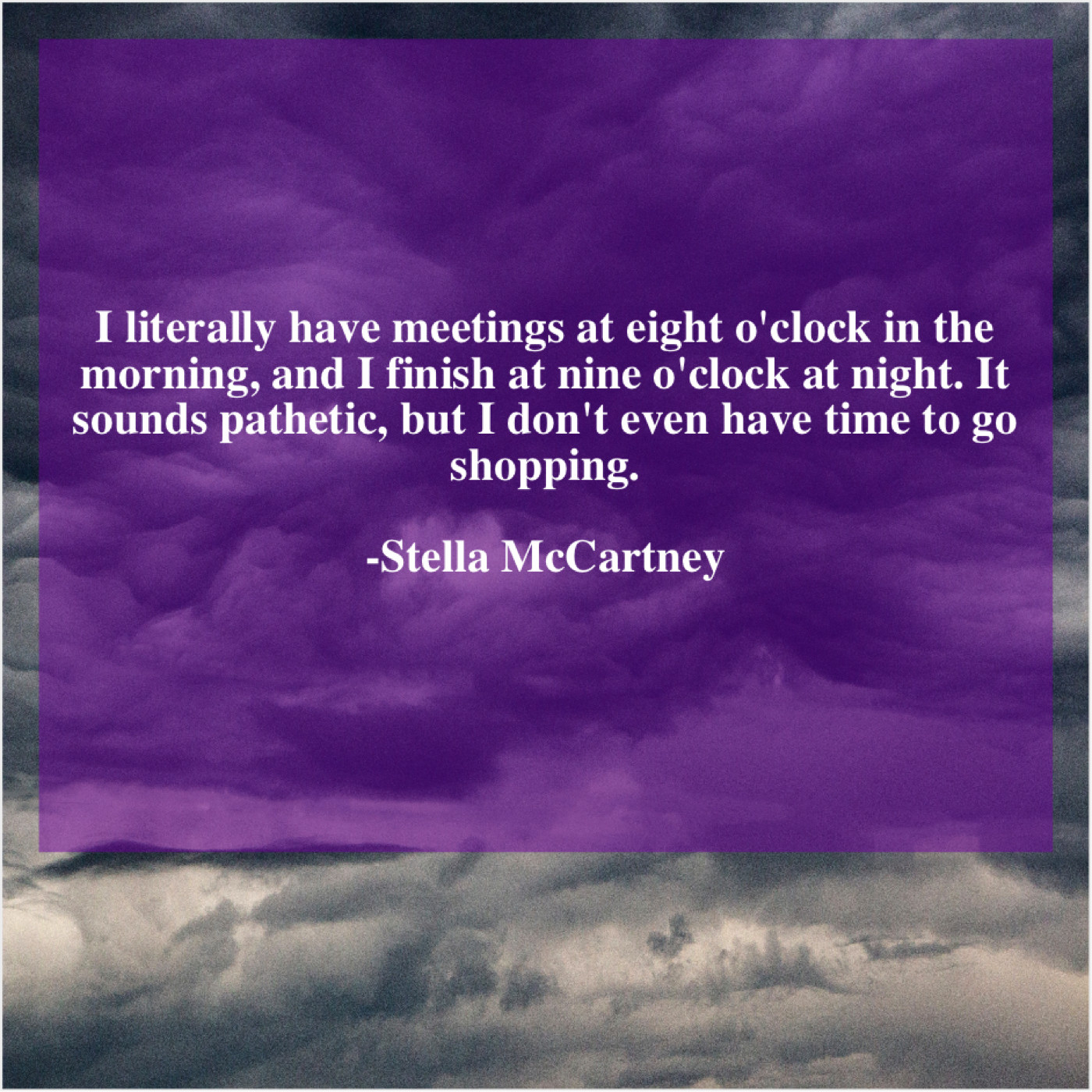 Stella McCartney Stella McCartney – I literally have meetings at… November 22, 2018 admin “I literally have meetings at eight o’clock in the morning, and I finish at nine o’clock at night. It sounds pathetic, but I don’t even have time to go shopping.”-Stella McCartney