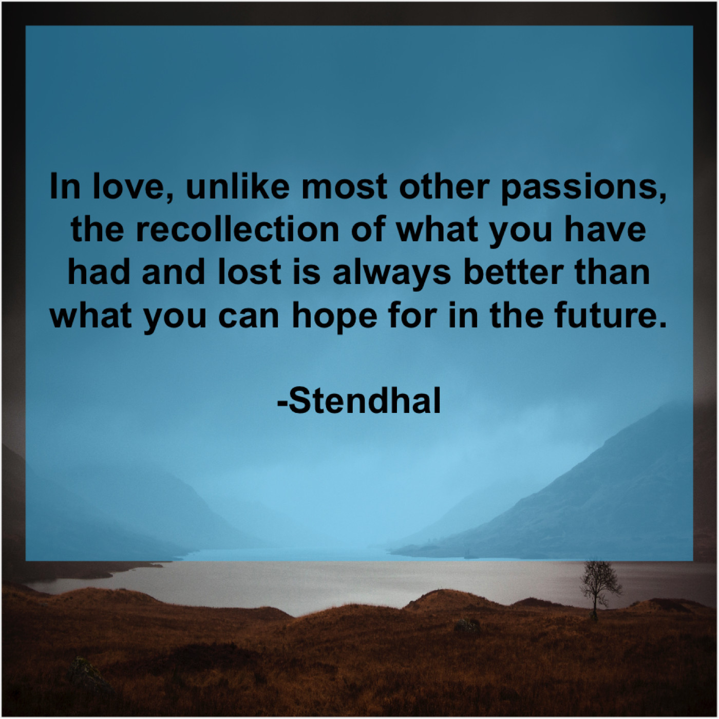 Stendhal Stendhal – In love, unlike most other… May 18, 2019 admin “In love, unlike most other passions, the recollection of what you have had and lost is always better than what you can hope for in the future.”-Stendhal