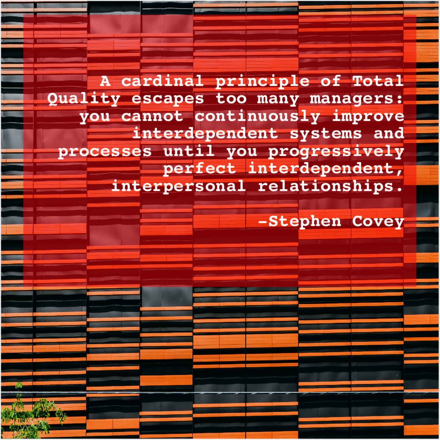 Stephen Covey Stephen Covey – A cardinal principle of Total… November 16, 2018 admin “A cardinal principle of Total Quality escapes too many managers: you cannot continuously improve interdependent systems and processes until you progressively perfect interdependent, interpersonal relationships.”-Stephen Covey