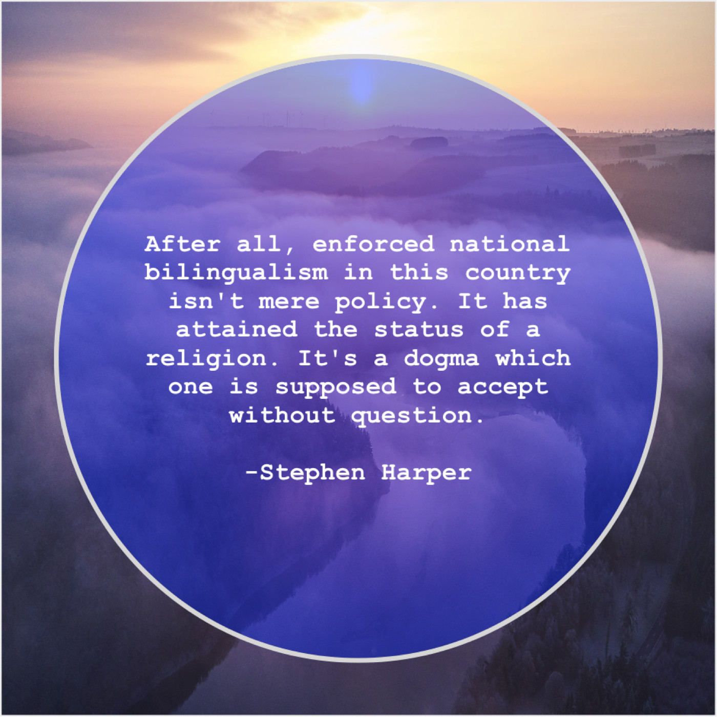 Stephen Harper Stephen Harper – After all, enforced national bilingualism… April 11, 2019 admin “After all, enforced national bilingualism in this country isn’t mere policy. It has attained the status of a religion. It’s a dogma which one is supposed to accept without question.”-Stephen Harper