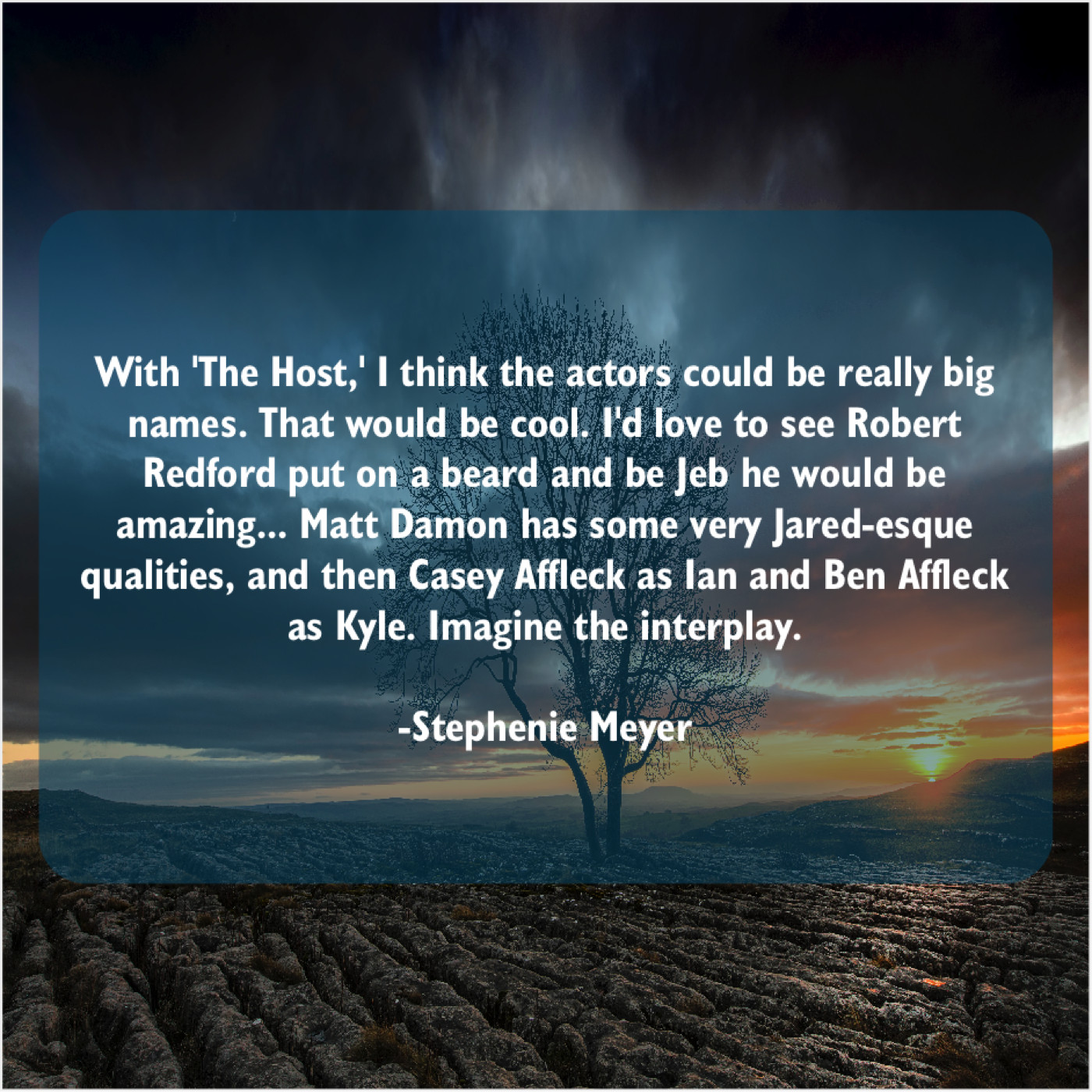 “With ‘The Host,’ I think the actors could be really big names. That would be cool. I’d love to see Robert Redford put on a beard and be Jeb he would be amazing… Matt Damon has some very Jared-esque qualities, and then Casey Affleck as Ian and Ben Affleck as Kyle. Imagine the interplay.”