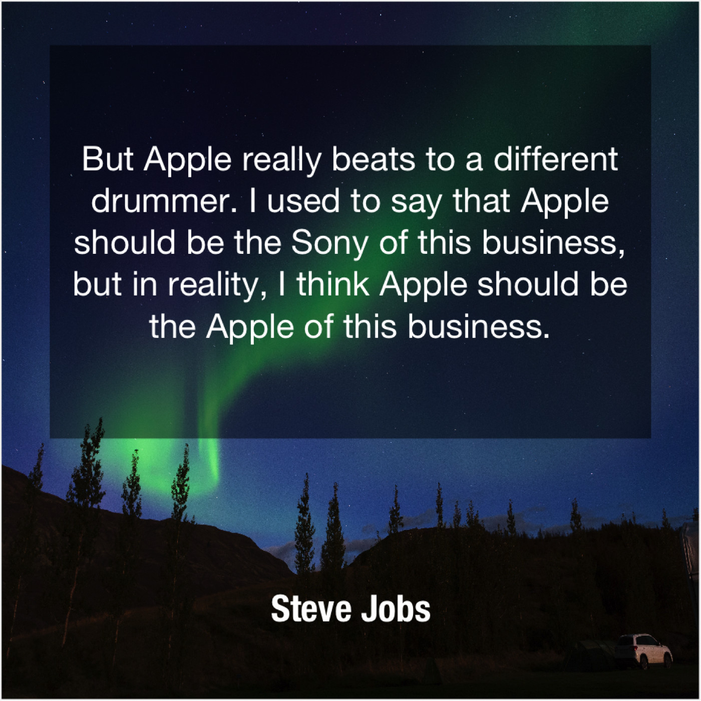 Steve Jobs Steve Jobs – But Apple really beats to… June 5, 2019 admin “But Apple really beats to a different drummer. I used to say that Apple should be the Sony of this business, but in reality, I think Apple should be the Apple of this business.”-Steve Jobs