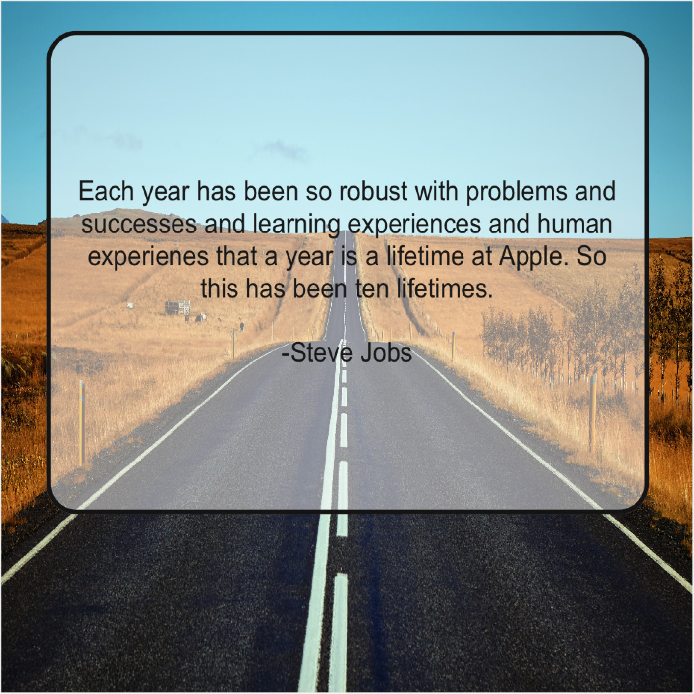 Steve Jobs Steve Jobs – Each year has been so… August 9, 2019 admin “Each year has been so robust with problems and successes and learning experiences and human experienes that a year is a lifetime at Apple. So this has been ten lifetimes.”-Steve Jobs