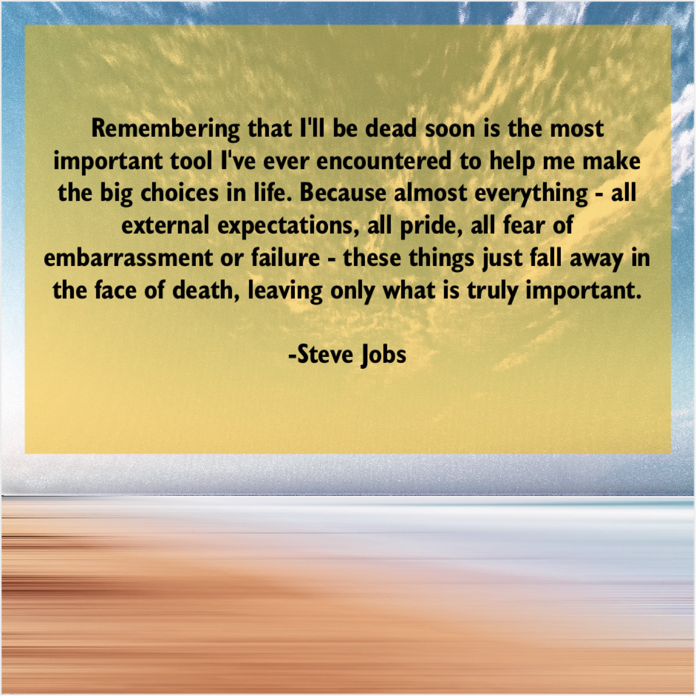 “Remembering that I’ll be dead soon is the most important tool I’ve ever encountered to help me make the big choices in life. Because almost everything – all external expectations, all pride, all fear of embarrassment or failure – these things just fall away in the face of death, leaving only what is truly important.”