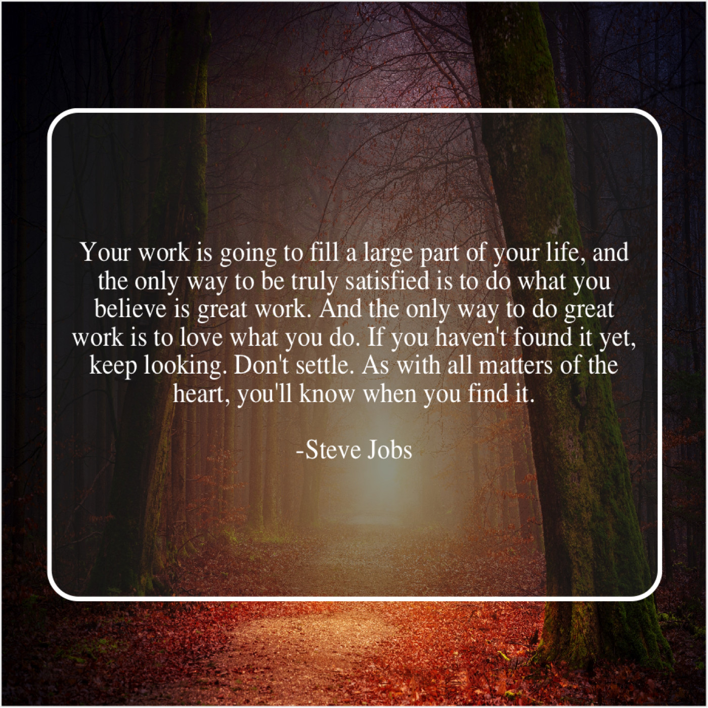 “Your work is going to fill a large part of your life, and the only way to be truly satisfied is to do what you believe is great work. And the only way to do great work is to love what you do. If you haven’t found it yet, keep looking. Don’t settle. As with all matters of the heart, you’ll know when you find it.”