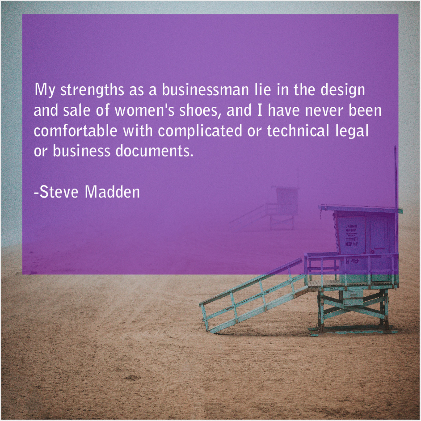 Steve Madden Steve Madden – My strengths as a businessman… October 3, 2019 admin “My strengths as a businessman lie in the design and sale of women’s shoes, and I have never been comfortable with complicated or technical legal or business documents.”-Steve Madden