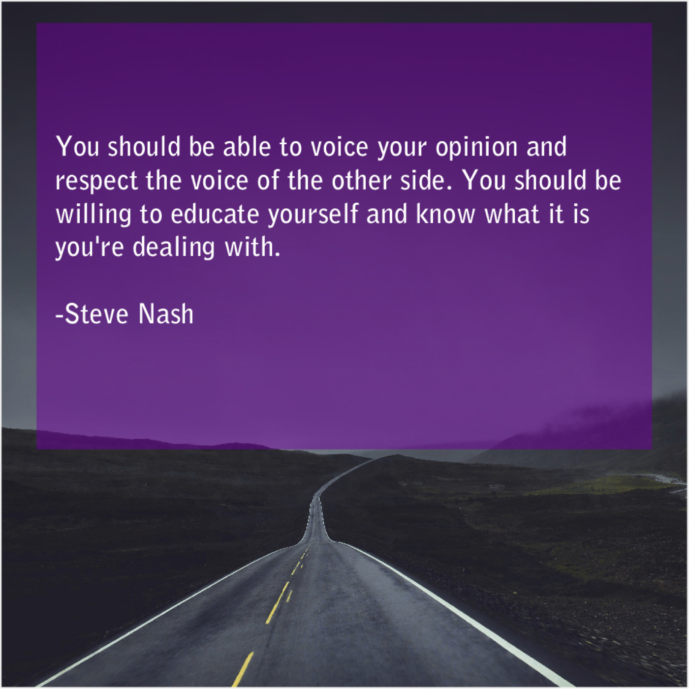 Steve Nash Steve Nash – You should be able to… November 16, 2018 admin “You should be able to voice your opinion and respect the voice of the other side. You should be willing to educate yourself and know what it is you’re dealing with.”-Steve Nash