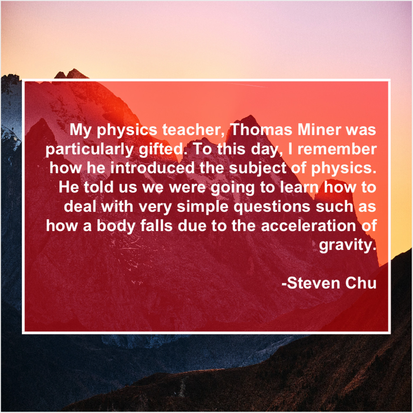 “My physics teacher, Thomas Miner was particularly gifted. To this day, I remember how he introduced the subject of physics. He told us we were going to learn how to deal with very simple questions such as how a body falls due to the acceleration of gravity.”