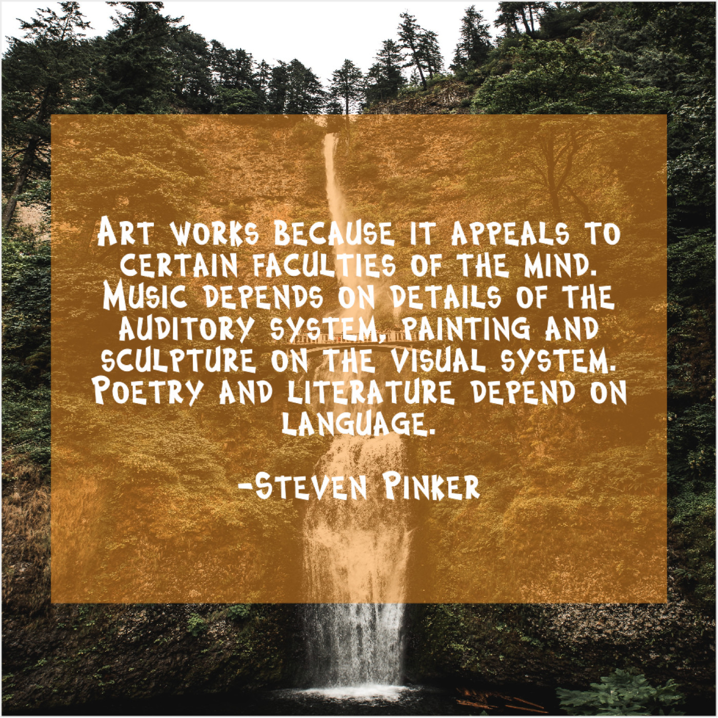 Steven Pinker Steven Pinker – Art works because it appeals… August 21, 2019 admin “Art works because it appeals to certain faculties of the mind. Music depends on details of the auditory system, painting and sculpture on the visual system. Poetry and literature depend on language.”-Steven Pinker