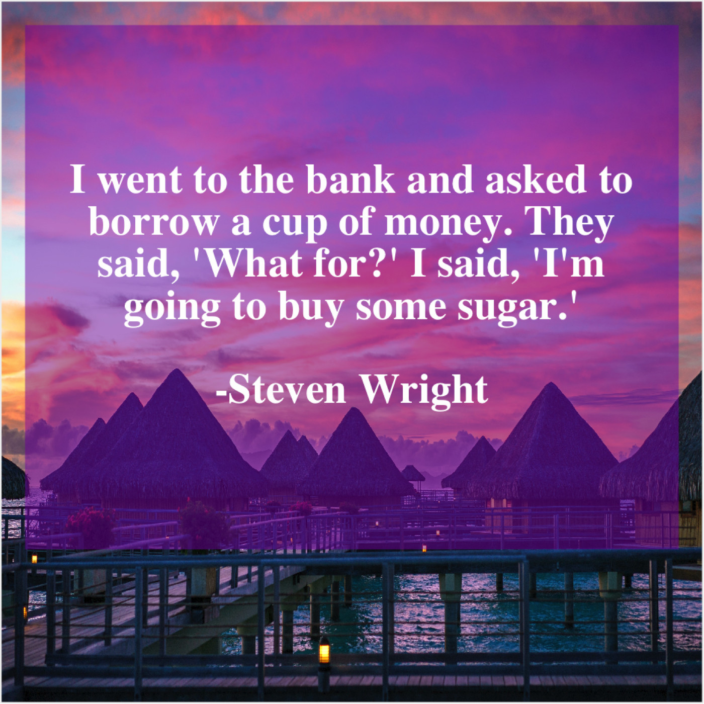 Steven Wright Steven Wright – I went to the bank… February 16, 2019 admin “I went to the bank and asked to borrow a cup of money. They said, ‘What for?’ I said, ‘I’m going to buy some sugar.'”-Steven Wright