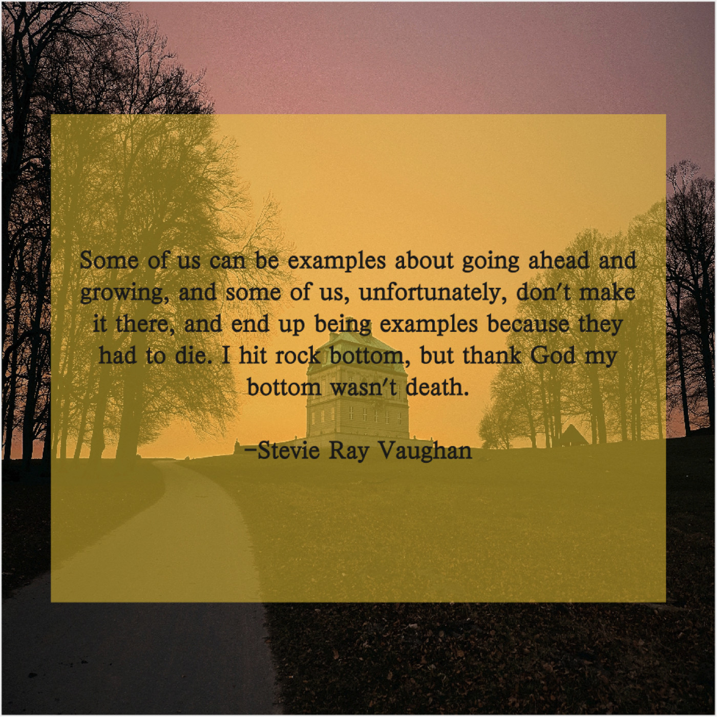 Stevie Ray Vaughan Stevie Ray Vaughan – Some of us can be… April 17, 2019 admin “Some of us can be examples about going ahead and growing, and some of us, unfortunately, don’t make it there, and end up being examples because they had to die. I hit rock bottom, but thank God my bottom wasn’t death.”-Stevie Ray Vaughan