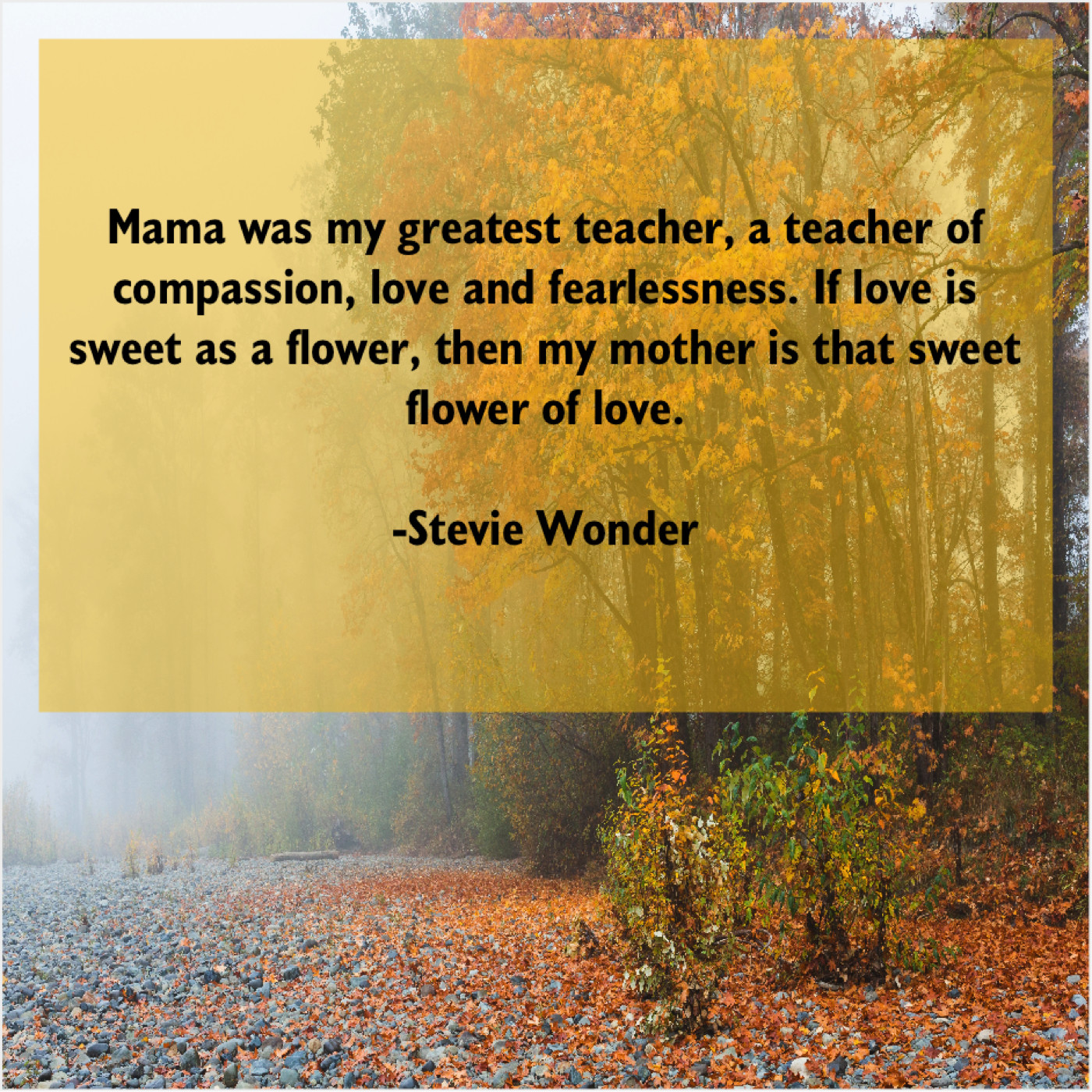 Stevie Wonder Stevie Wonder – Mama was my greatest teacher… April 19, 2019 admin “Mama was my greatest teacher, a teacher of compassion, love and fearlessness. If love is sweet as a flower, then my mother is that sweet flower of love.”-Stevie Wonder