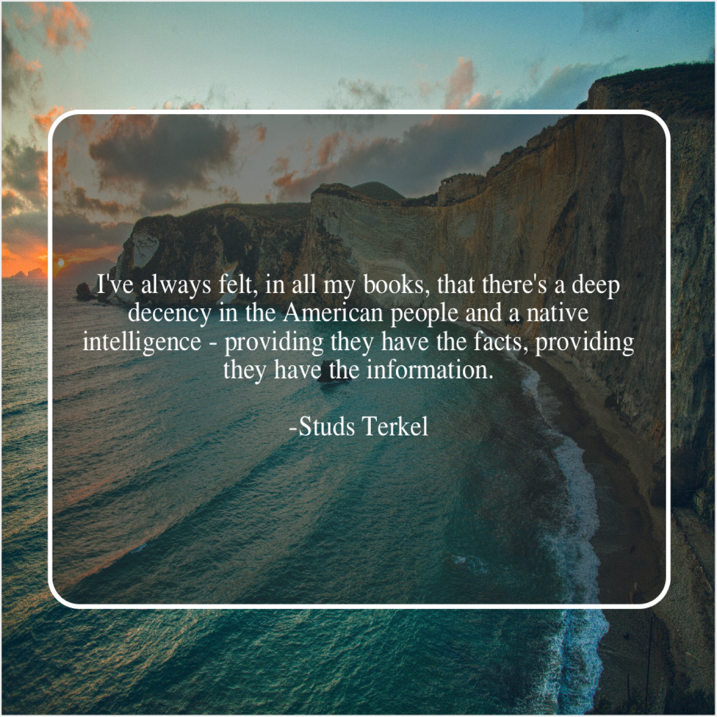 Studs Terkel Studs Terkel – I’ve always felt, in all… November 29, 2018 admin “I’ve always felt, in all my books, that there’s a deep decency in the American people and a native intelligence – providing they have the facts, providing they have the information.”-Studs Terkel