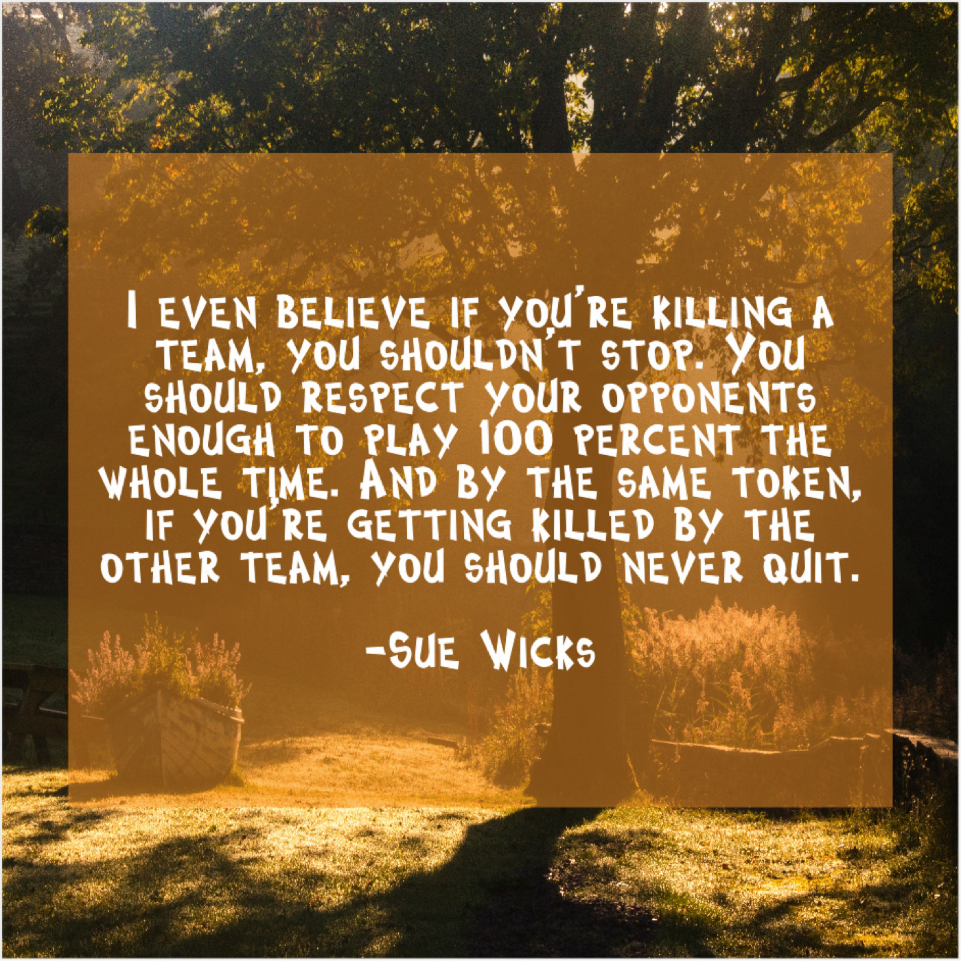 Sue Wicks Sue Wicks – I even believe if you’re… August 14, 2019 admin “I even believe if you’re killing a team, you shouldn’t stop. You should respect your opponents enough to play 100 percent the whole time. And by the same token, if you’re getting killed by the other team, you should never quit.”-Sue Wicks