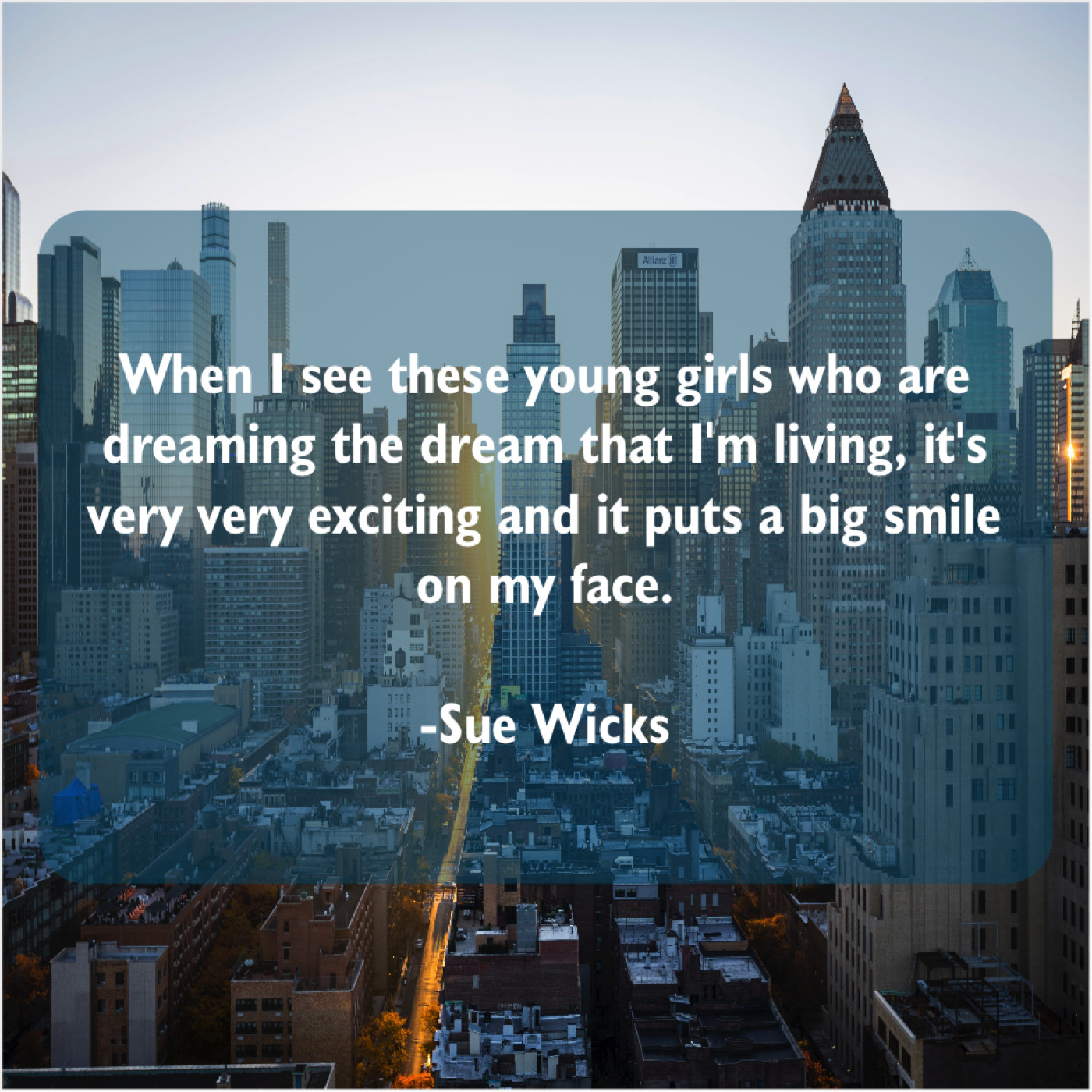Sue Wicks Sue Wicks – When I see these young… June 9, 2019 admin “When I see these young girls who are dreaming the dream that I’m living, it’s very very exciting and it puts a big smile on my face.”-Sue Wicks