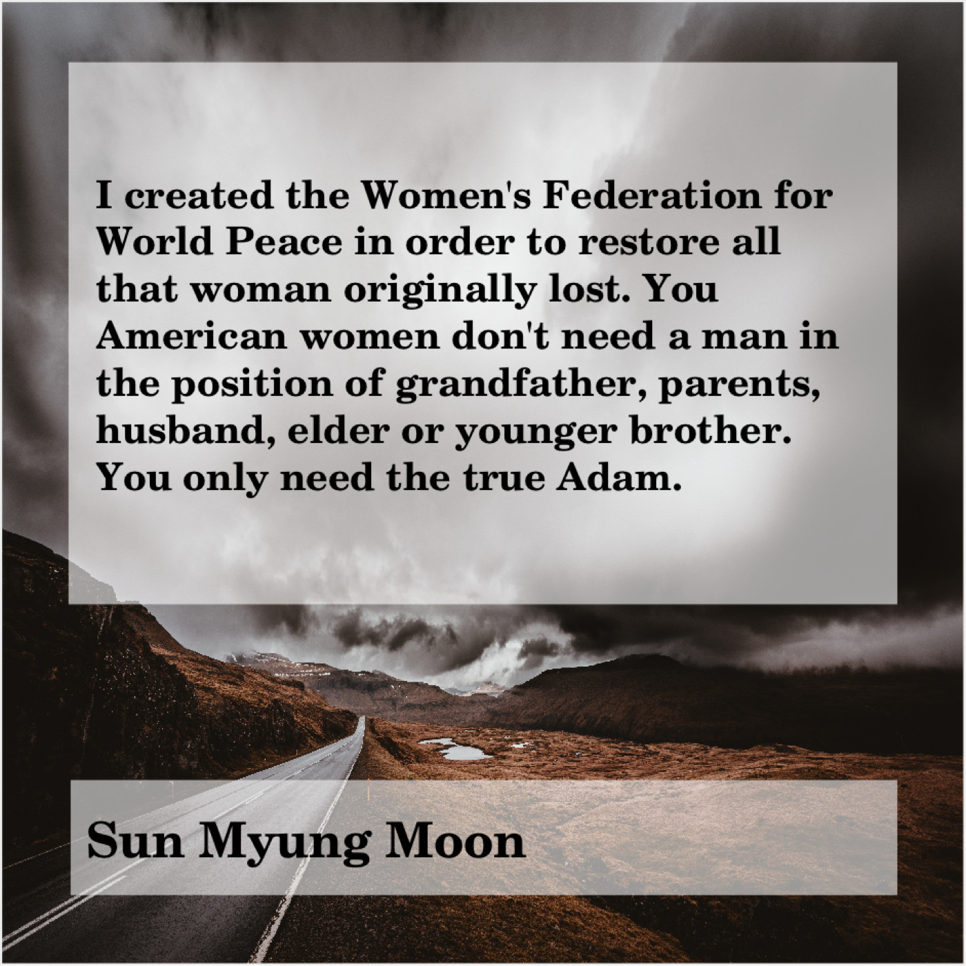 “I created the Women’s Federation for World Peace in order to restore all that woman originally lost. You American women don’t need a man in the position of grandfather, parents, husband, elder or younger brother. You only need the true Adam.”