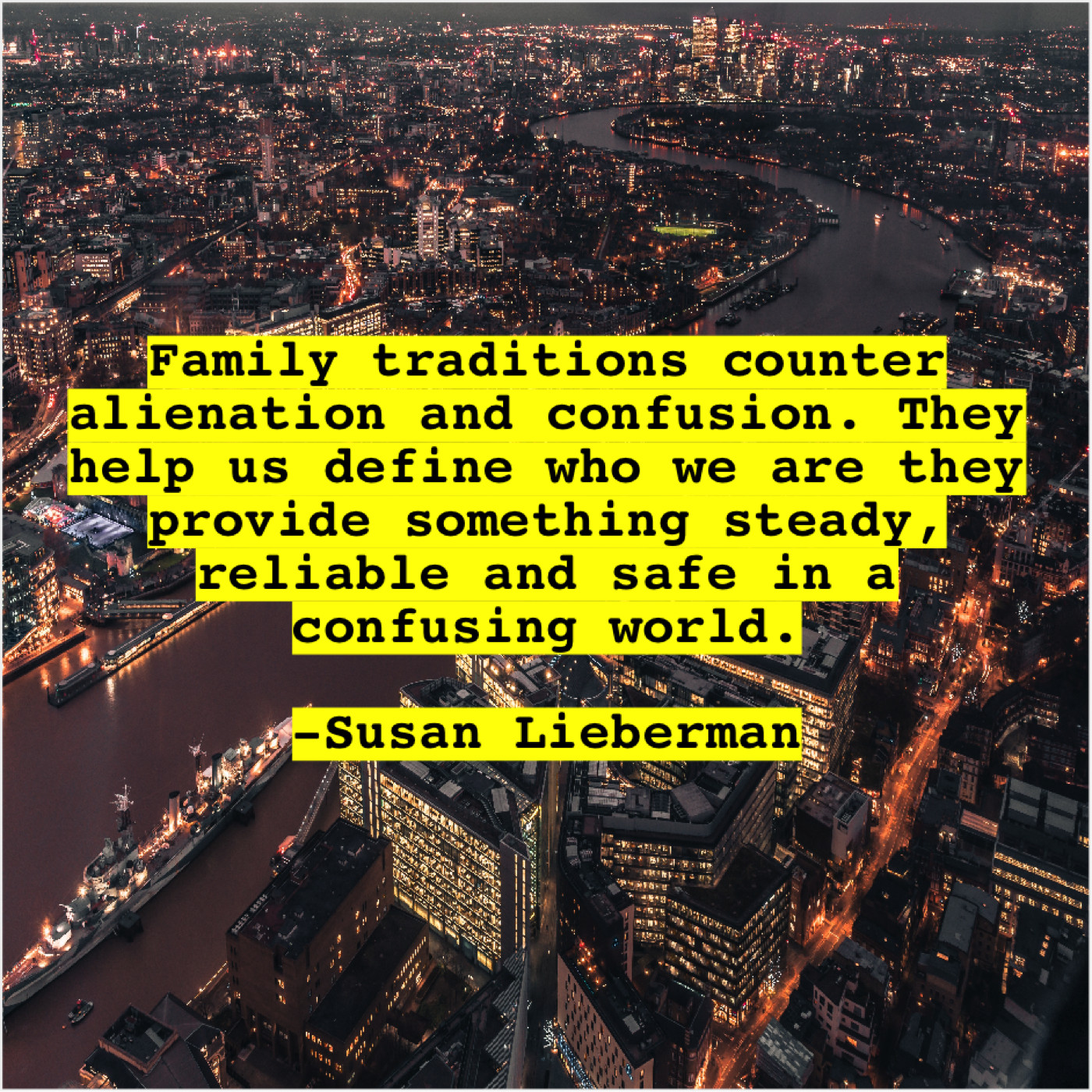 Susan Lieberman Susan Lieberman – Family traditions counter alienation and… August 4, 2019 admin “Family traditions counter alienation and confusion. They help us define who we are they provide something steady, reliable and safe in a confusing world.”-Susan Lieberman