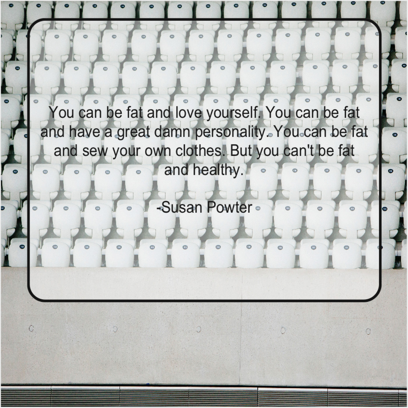 Susan Powter Susan Powter – You can be fat and… July 31, 2019 admin “You can be fat and love yourself. You can be fat and have a great damn personality. You can be fat and sew your own clothes. But you can’t be fat and healthy.”-Susan Powter