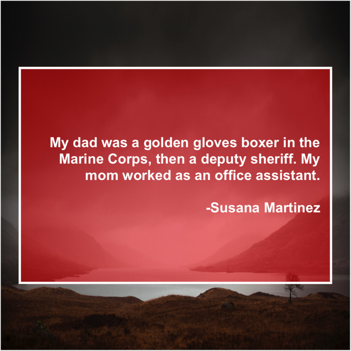 Susana Martinez Susana Martinez – My dad was a golden… March 17, 2019 admin “My dad was a golden gloves boxer in the Marine Corps, then a deputy sheriff. My mom worked as an office assistant.”-Susana Martinez