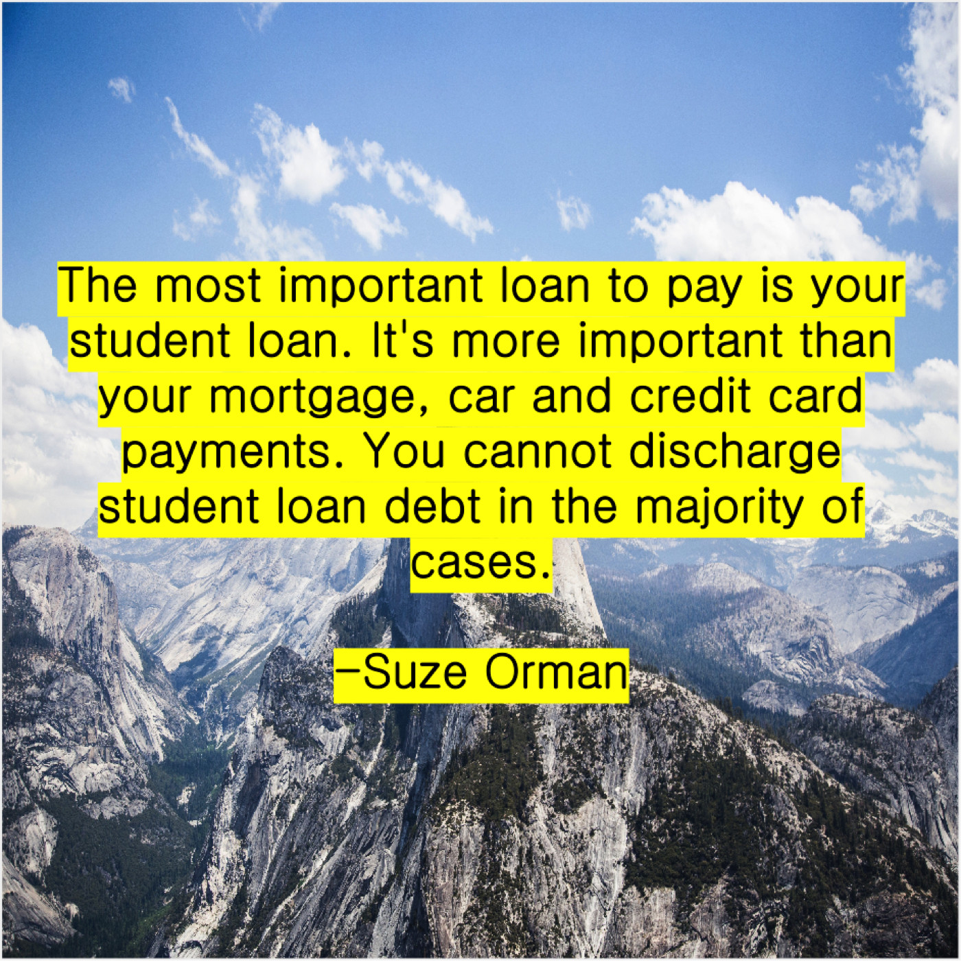 Suze Orman Suze Orman – The most important loan to… June 10, 2019 admin “The most important loan to pay is your student loan. It’s more important than your mortgage, car and credit card payments. You cannot discharge student loan debt in the majority of cases.”-Suze Orman