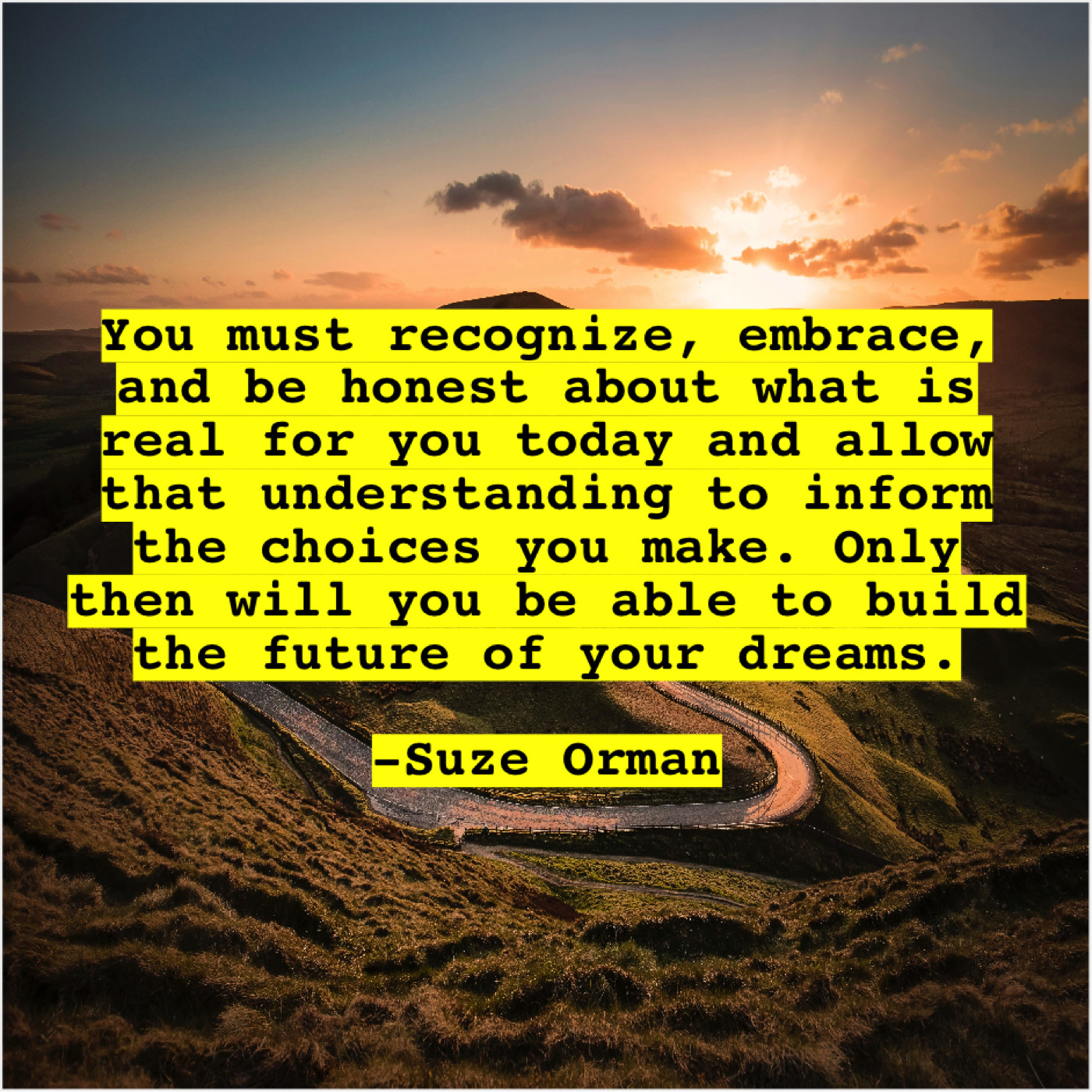 Suze Orman Suze Orman – You must recognize, embrace, and… February 13, 2019 admin “You must recognize, embrace, and be honest about what is real for you today and allow that understanding to inform the choices you make. Only then will you be able to build the future of your dreams.”-Suze Orman