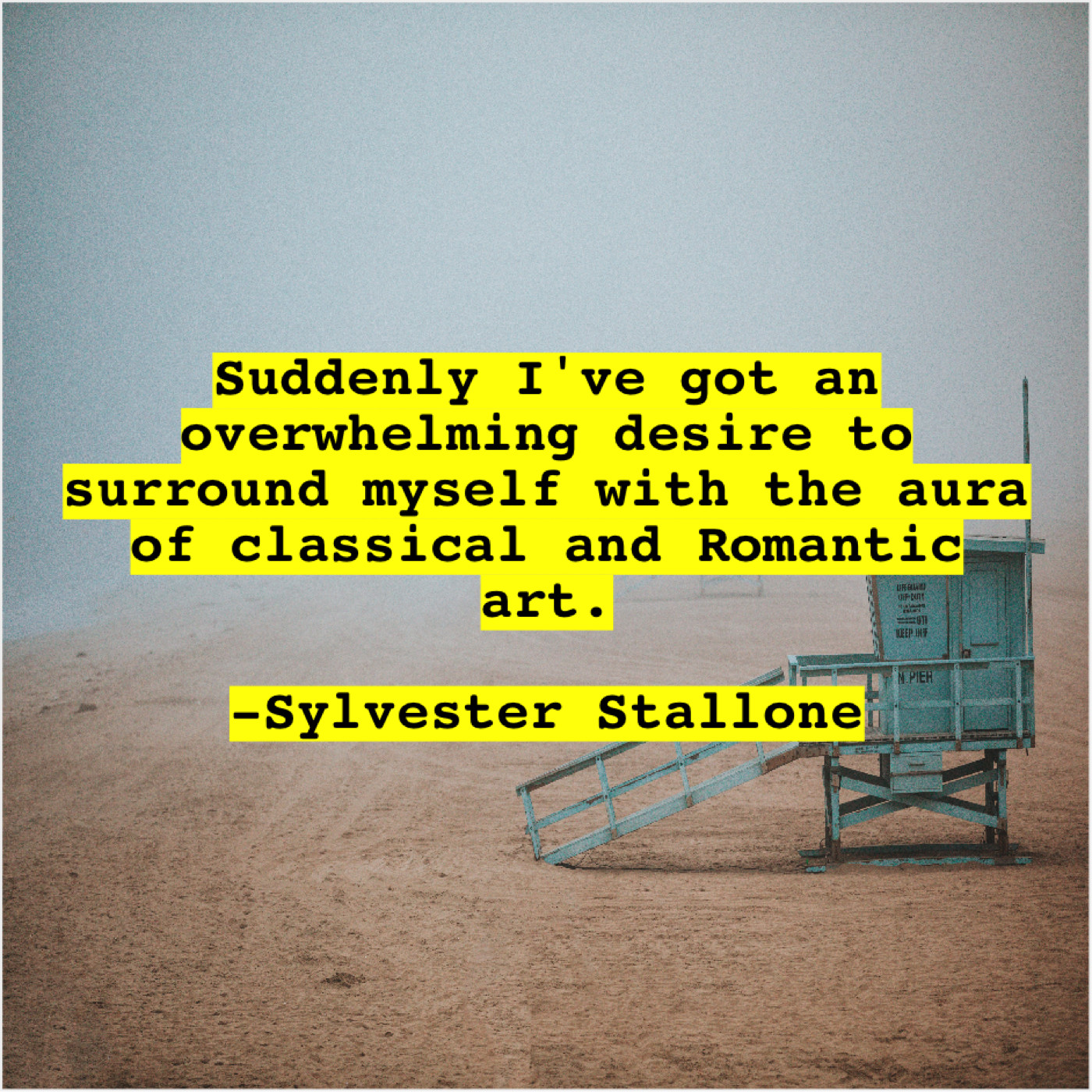 Sylvester Stallone Sylvester Stallone – Suddenly I’ve got an overwhelming… April 23, 2019 admin “Suddenly I’ve got an overwhelming desire to surround myself with the aura of classical and Romantic art.”-Sylvester Stallone