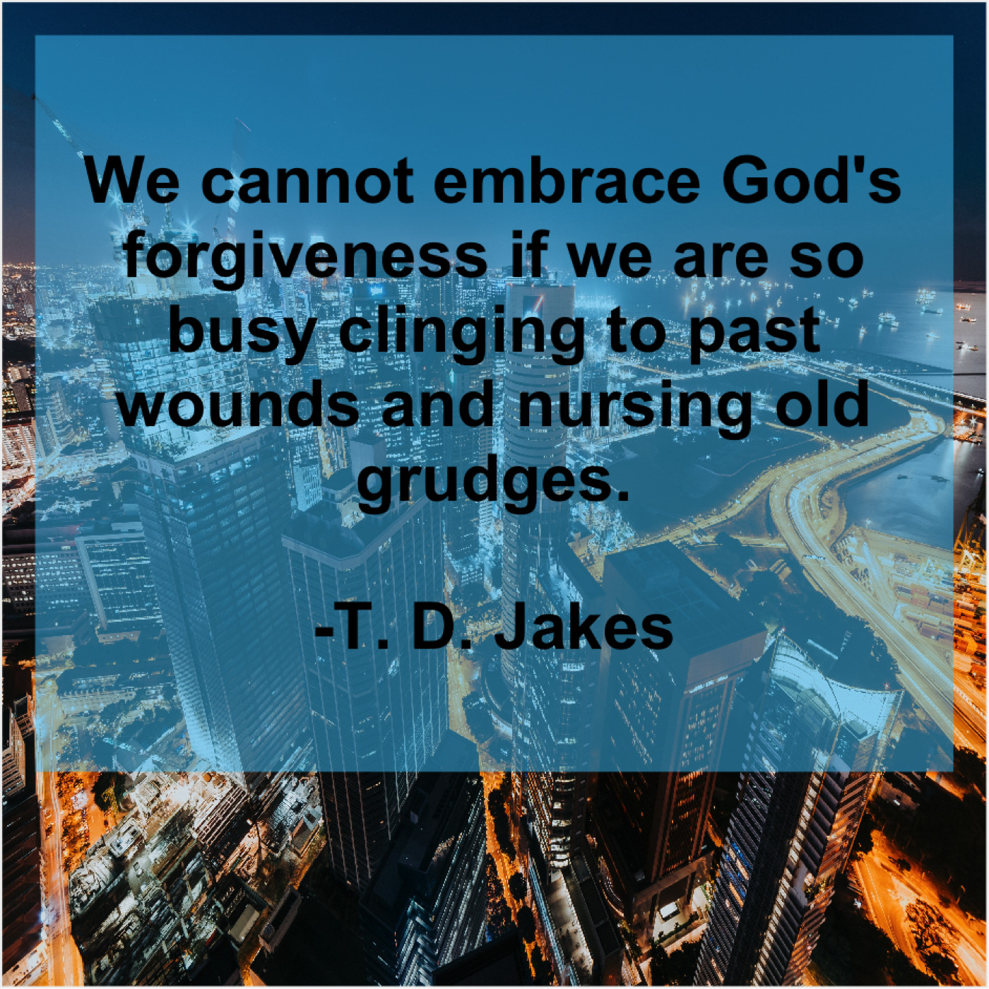 T. D. Jakes T. D. Jakes – We cannot embrace God’s forgiveness… September 11, 2019 admin “We cannot embrace God’s forgiveness if we are so busy clinging to past wounds and nursing old grudges.”-T. D. Jakes
