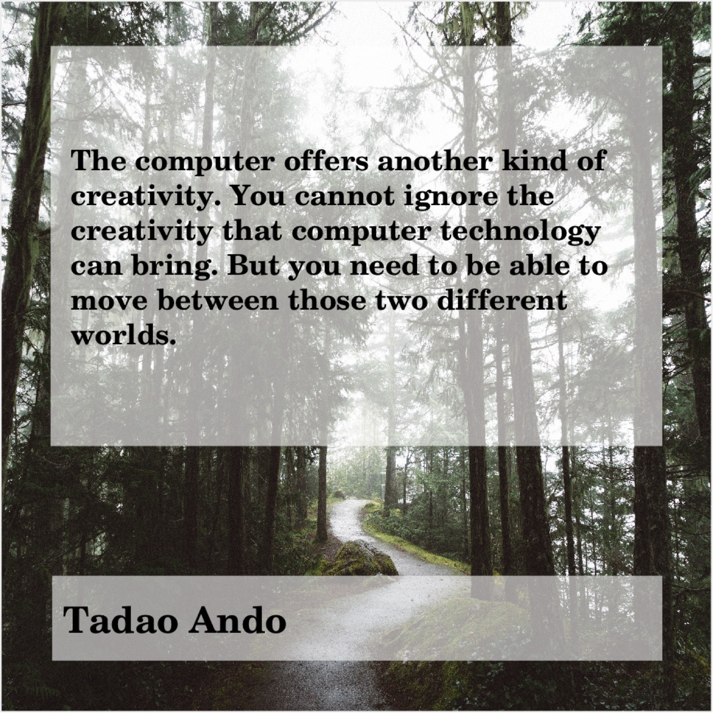 Tadao Ando Tadao Ando – The computer offers another kind… March 27, 2019 admin “The computer offers another kind of creativity. You cannot ignore the creativity that computer technology can bring. But you need to be able to move between those two different worlds.”-Tadao Ando