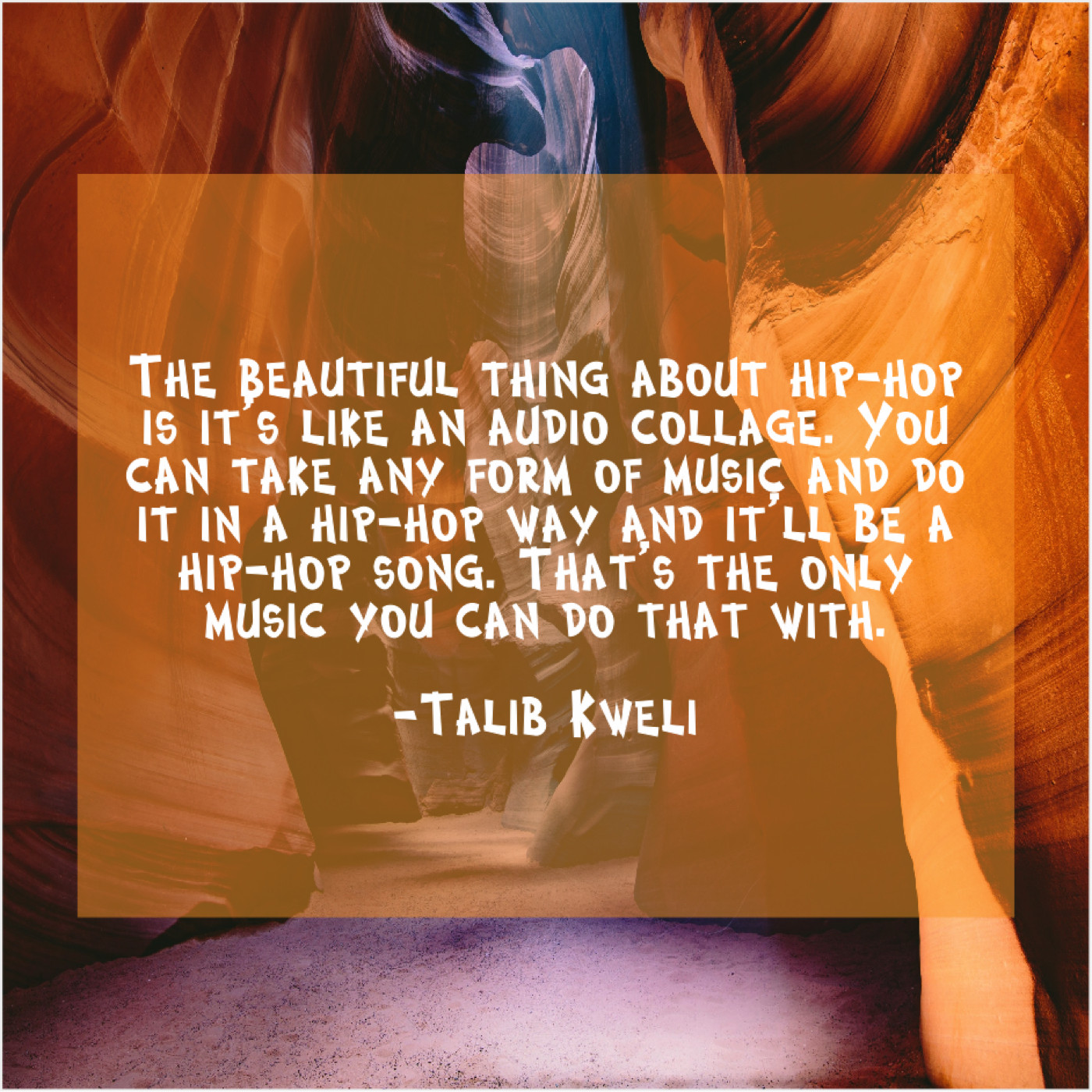 Talib Kweli Talib Kweli – The beautiful thing about hip… April 8, 2019 admin “The beautiful thing about hip-hop is it’s like an audio collage. You can take any form of music and do it in a hip-hop way and it’ll be a hip-hop song. That’s the only music you can do that with.”-Talib Kweli