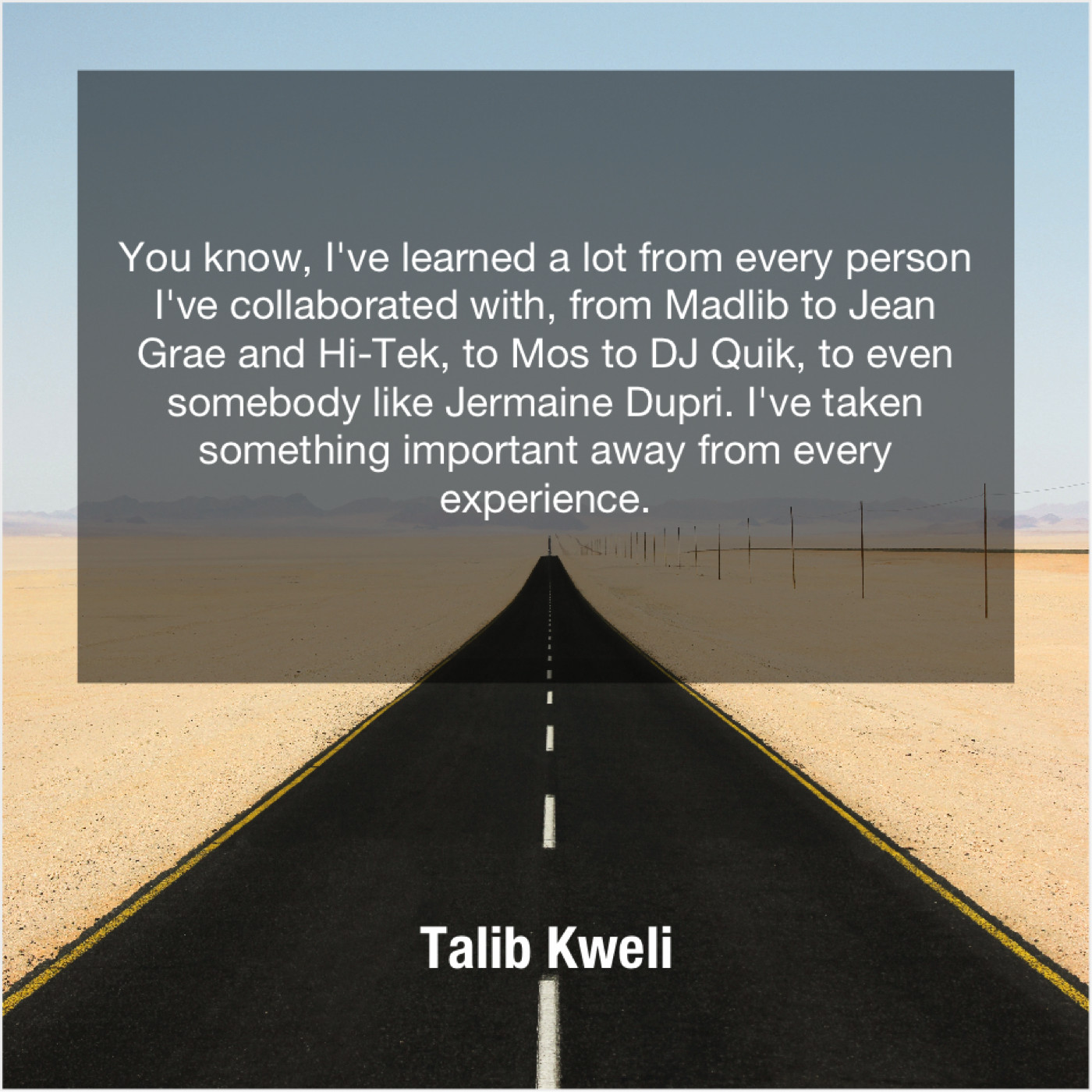 Talib Kweli Talib Kweli – You know, I’ve learned a… March 14, 2019 admin “You know, I’ve learned a lot from every person I’ve collaborated with, from Madlib to Jean Grae and Hi-Tek, to Mos to DJ Quik, to even somebody like Jermaine Dupri. I’ve taken something important away from every experience.”-Talib Kweli