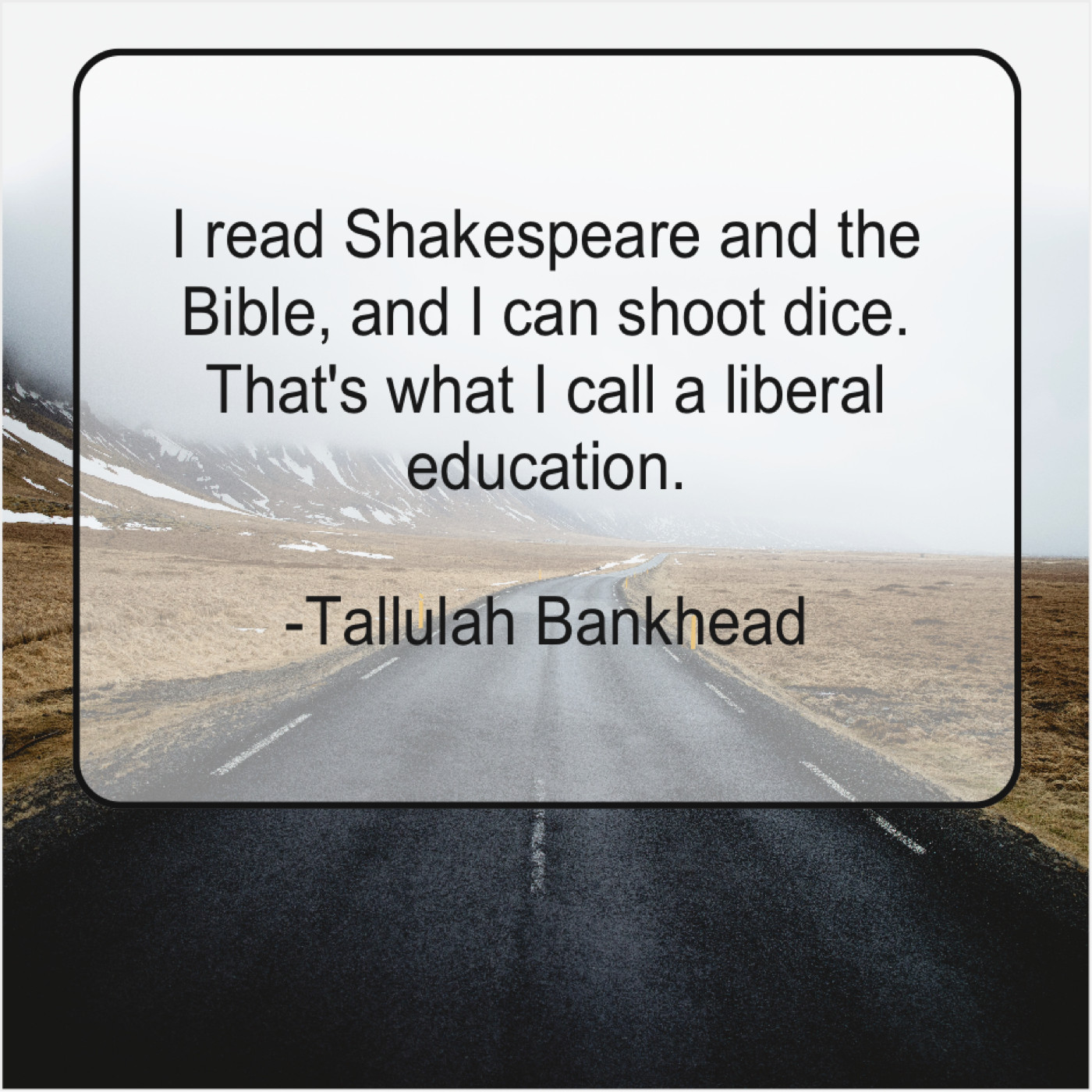 Tallulah Bankhead Tallulah Bankhead – I read Shakespeare and the… March 3, 2019 admin “I read Shakespeare and the Bible, and I can shoot dice. That’s what I call a liberal education.”-Tallulah Bankhead
