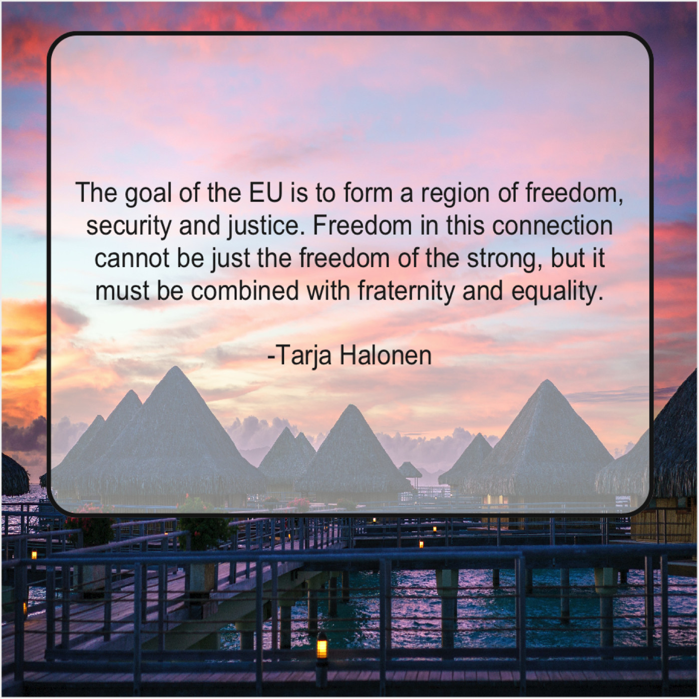 Tarja Halonen Tarja Halonen – The goal of the EU… June 18, 2019 admin “The goal of the EU is to form a region of freedom, security and justice. Freedom in this connection cannot be just the freedom of the strong, but it must be combined with fraternity and equality.”-Tarja Halonen
