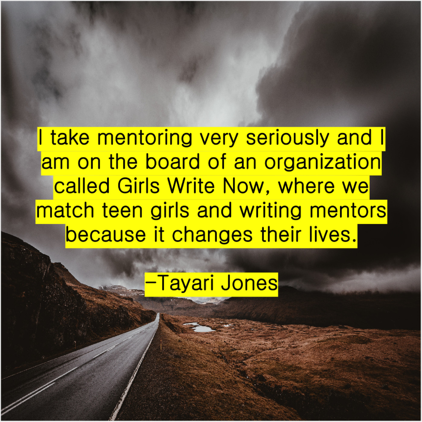 Tayari Jones Tayari Jones – I take mentoring very seriously… June 26, 2019 admin “I take mentoring very seriously and I am on the board of an organization called Girls Write Now, where we match teen girls and writing mentors because it changes their lives.”-Tayari Jones