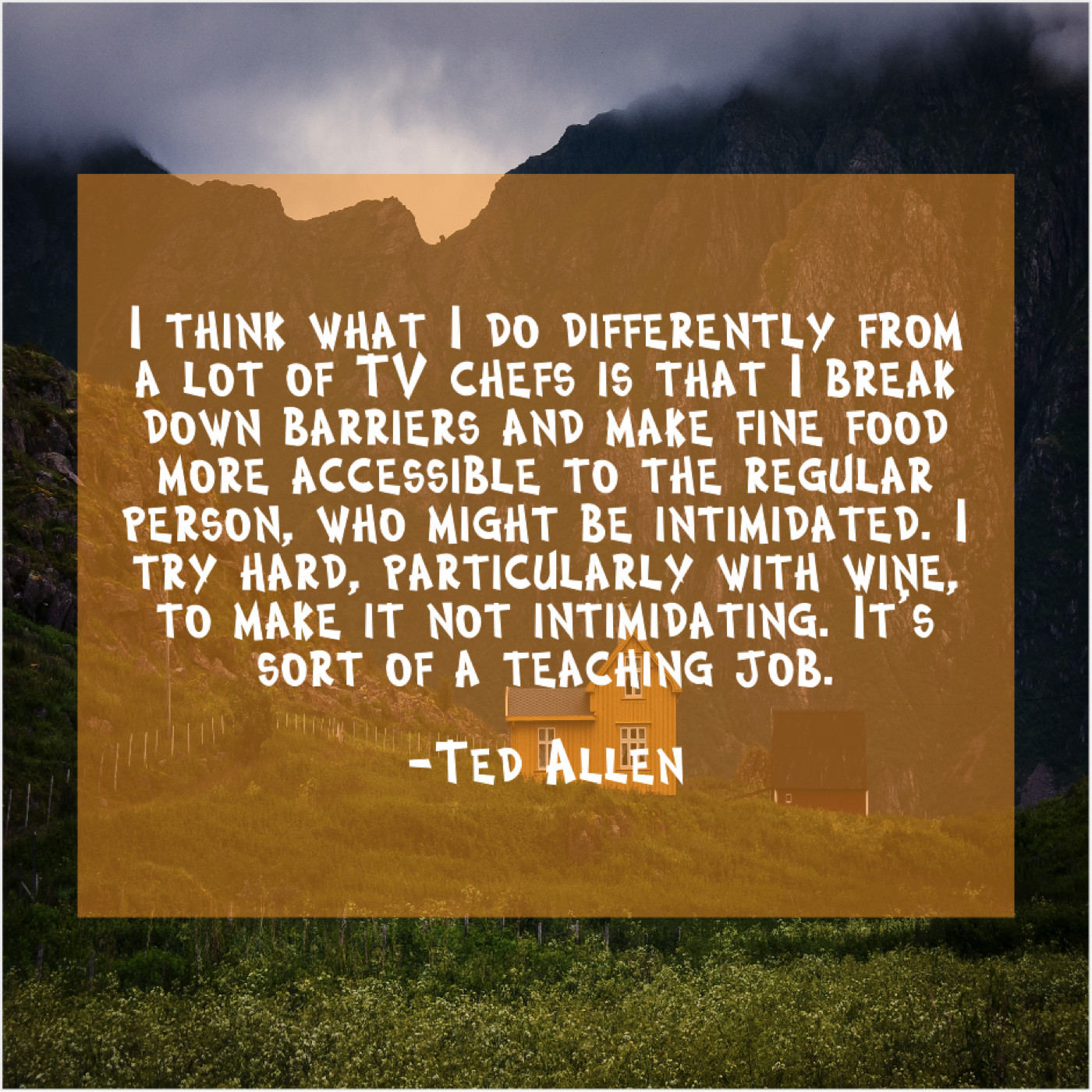 “I think what I do differently from a lot of TV chefs is that I break down barriers and make fine food more accessible to the regular person, who might be intimidated. I try hard, particularly with wine, to make it not intimidating. It’s sort of a teaching job.”