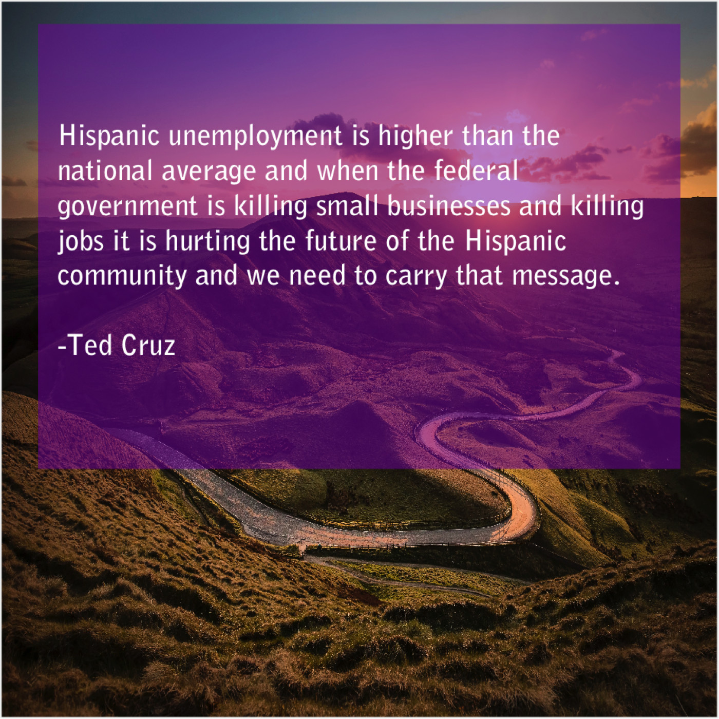 Ted Cruz Ted Cruz – Hispanic unemployment is higher than… April 11, 2019 admin “Hispanic unemployment is higher than the national average and when the federal government is killing small businesses and killing jobs it is hurting the future of the Hispanic community and we need to carry that message.”-Ted Cruz