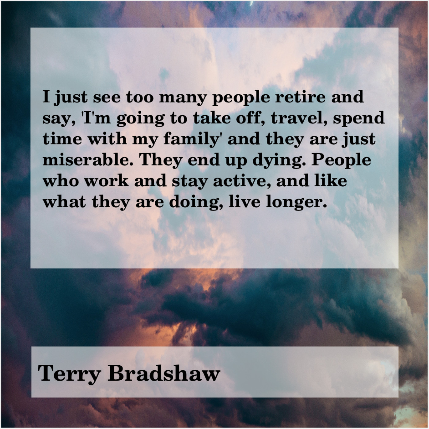 Terry Bradshaw Terry Bradshaw – I just see too many… December 14, 2018 admin “I just see too many people retire and say, ‘I’m going to take off, travel, spend time with my family’ and they are just miserable. They end up dying. People who work and stay active, and like what they are doing, live longer.”-Terry Bradshaw