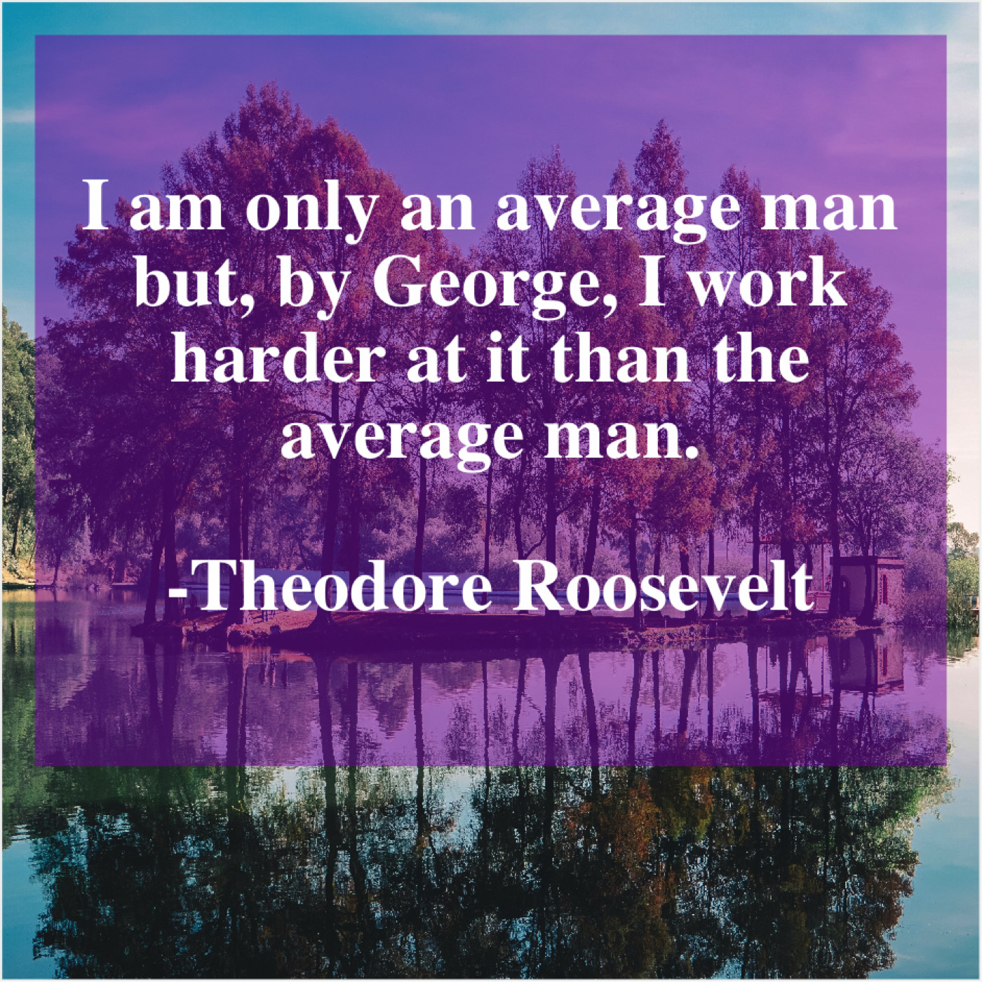 Theodore Roosevelt Theodore Roosevelt – I am only an average… March 18, 2019 admin “I am only an average man but, by George, I work harder at it than the average man.”-Theodore Roosevelt