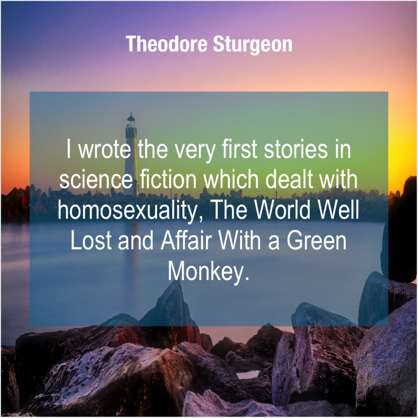 Theodore Sturgeon Theodore Sturgeon – I wrote the very first… November 12, 2018 admin “I wrote the very first stories in science fiction which dealt with homosexuality, The World Well Lost and Affair With a Green Monkey.”-Theodore Sturgeon