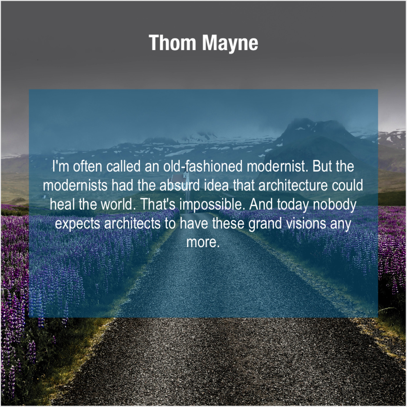 Thom Mayne Thom Mayne – I’m often called an old… February 20, 2019 admin “I’m often called an old-fashioned modernist. But the modernists had the absurd idea that architecture could heal the world. That’s impossible. And today nobody expects architects to have these grand visions any more.”-Thom Mayne