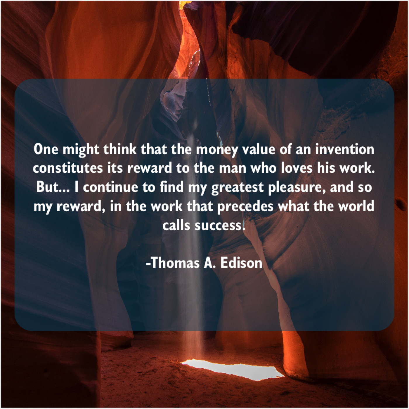 Thomas A. Edison Thomas A. Edison – One might think that the… May 22, 2019 admin “One might think that the money value of an invention constitutes its reward to the man who loves his work. But… I continue to find my greatest pleasure, and so my reward, in the work that precedes what the world calls success.”-Thomas A. Edison