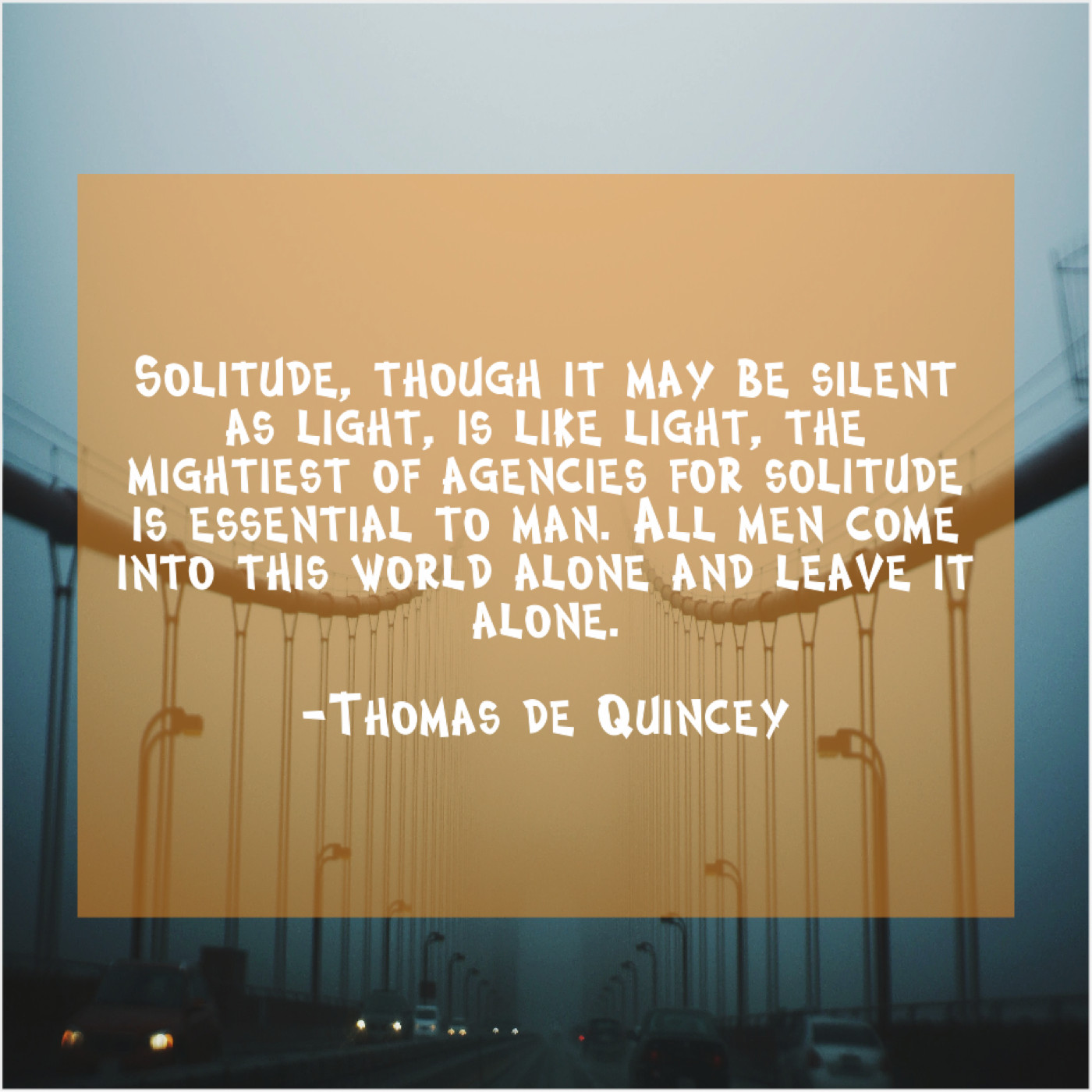 Thomas de Quincey Thomas de Quincey – Solitude, though it may be… November 10, 2018 admin “Solitude, though it may be silent as light, is like light, the mightiest of agencies for solitude is essential to man. All men come into this world alone and leave it alone.”-Thomas de Quincey