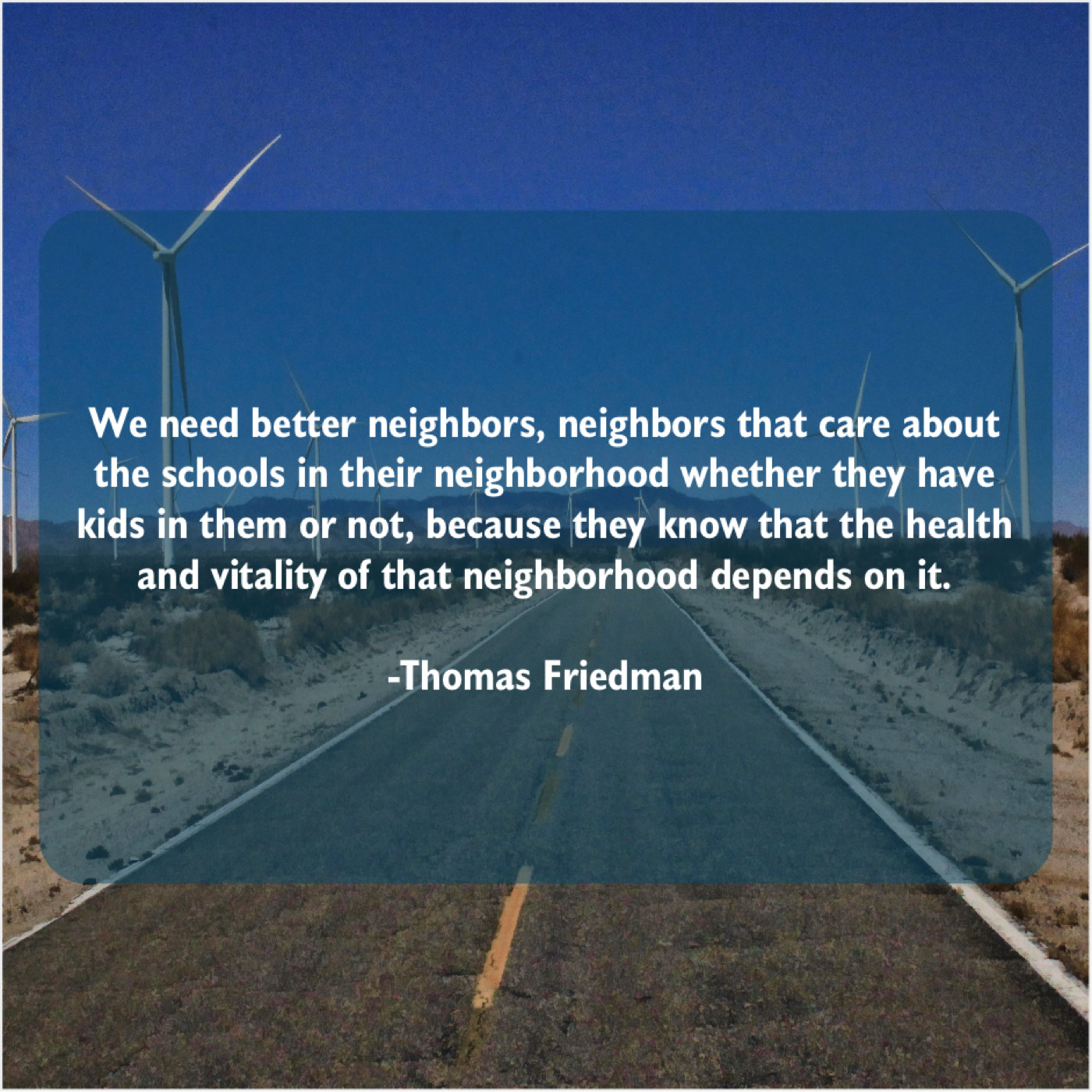 Thomas Friedman Thomas Friedman – We need better neighbors, neighbors… November 20, 2018 admin “We need better neighbors, neighbors that care about the schools in their neighborhood whether they have kids in them or not, because they know that the health and vitality of that neighborhood depends on it.”-Thomas Friedman