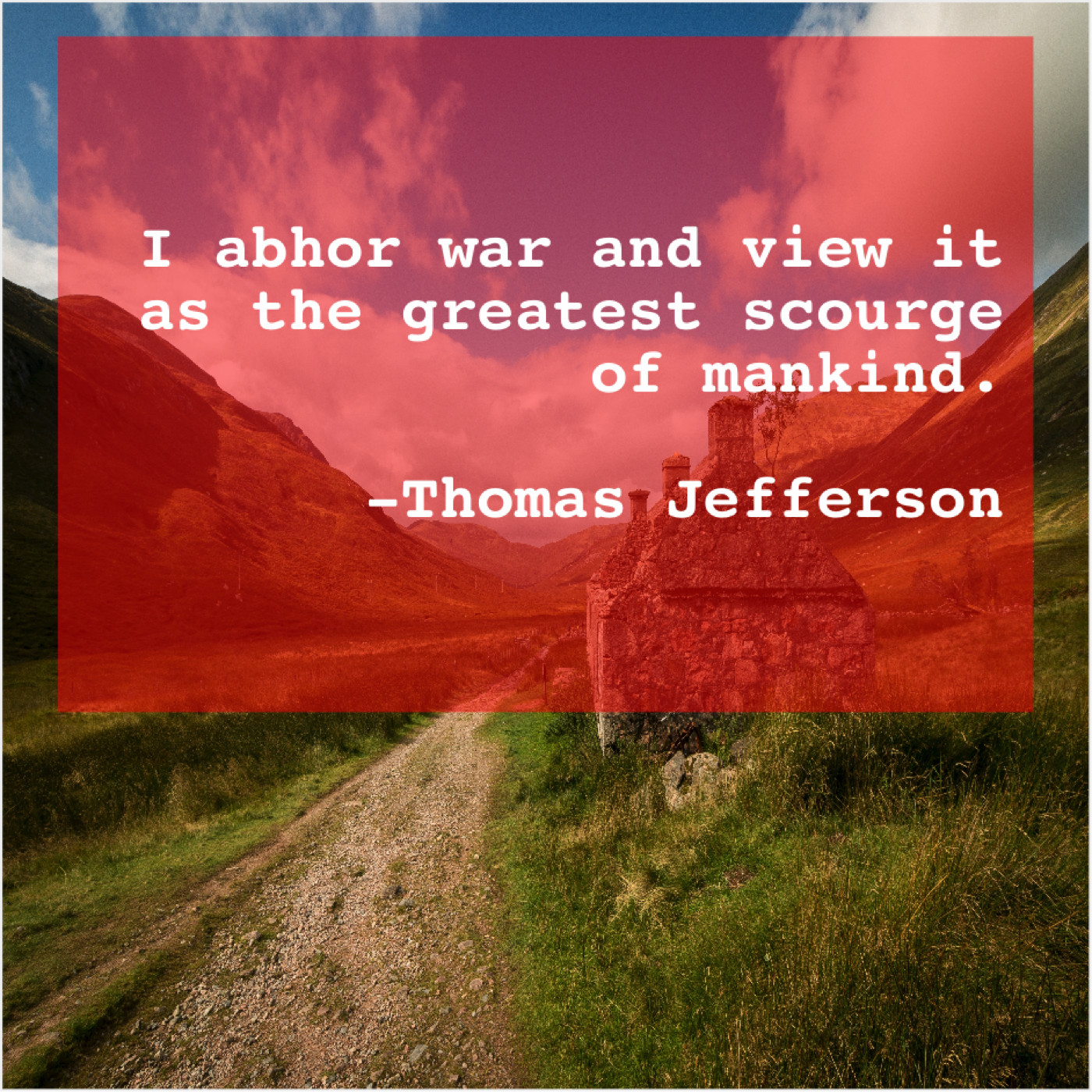 Thomas Jefferson Thomas Jefferson – I abhor war and view… November 8, 2018 admin “I abhor war and view it as the greatest scourge of mankind.”-Thomas Jefferson