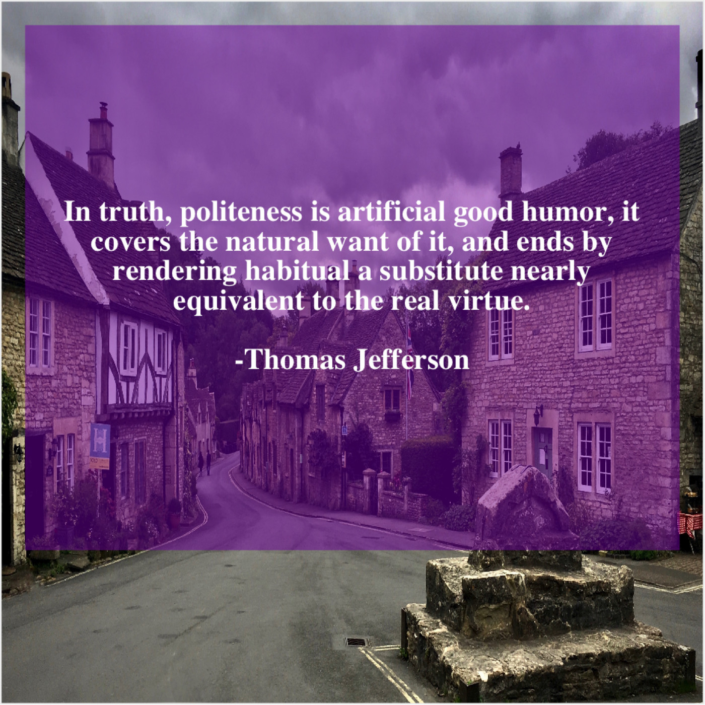 Thomas Jefferson Thomas Jefferson – In truth, politeness is artificial… June 10, 2019 admin “In truth, politeness is artificial good humor, it covers the natural want of it, and ends by rendering habitual a substitute nearly equivalent to the real virtue.”-Thomas Jefferson