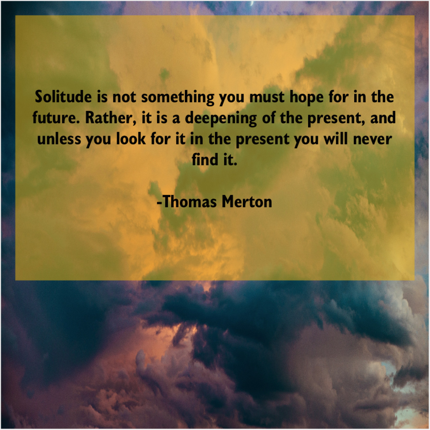 Thomas Merton Thomas Merton – Solitude is not something you… October 12, 2019 admin “Solitude is not something you must hope for in the future. Rather, it is a deepening of the present, and unless you look for it in the present you will never find it.”-Thomas Merton
