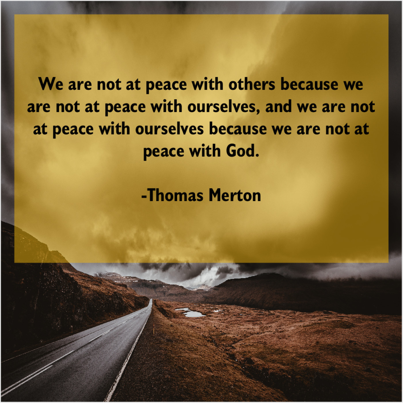 Thomas Merton Thomas Merton – We are not at peace… February 28, 2019 admin “We are not at peace with others because we are not at peace with ourselves, and we are not at peace with ourselves because we are not at peace with God.”-Thomas Merton