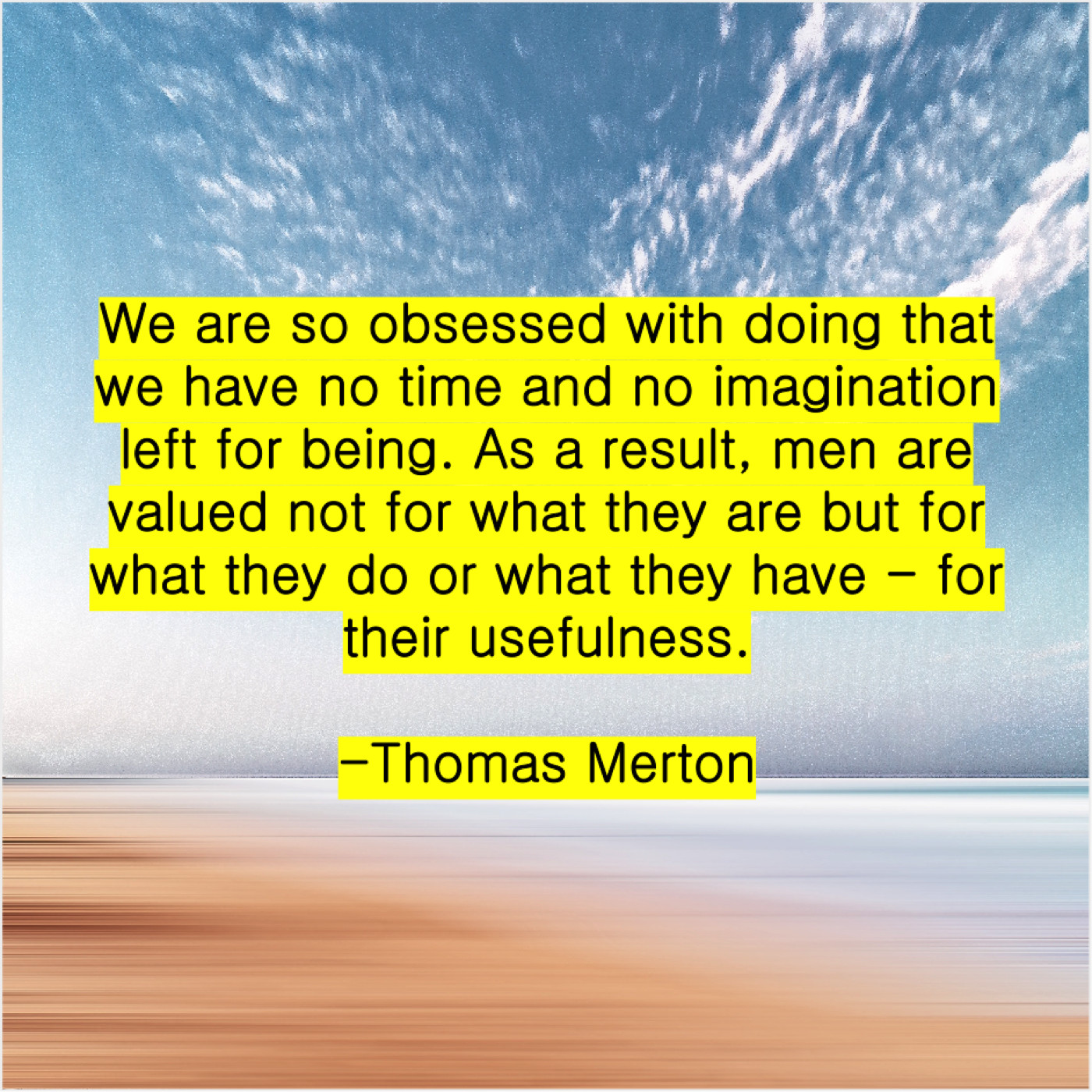 Thomas Merton Thomas Merton – We are so obsessed with… April 6, 2019 admin “We are so obsessed with doing that we have no time and no imagination left for being. As a result, men are valued not for what they are but for what they do or what they have – for their usefulness.”-Thomas Merton