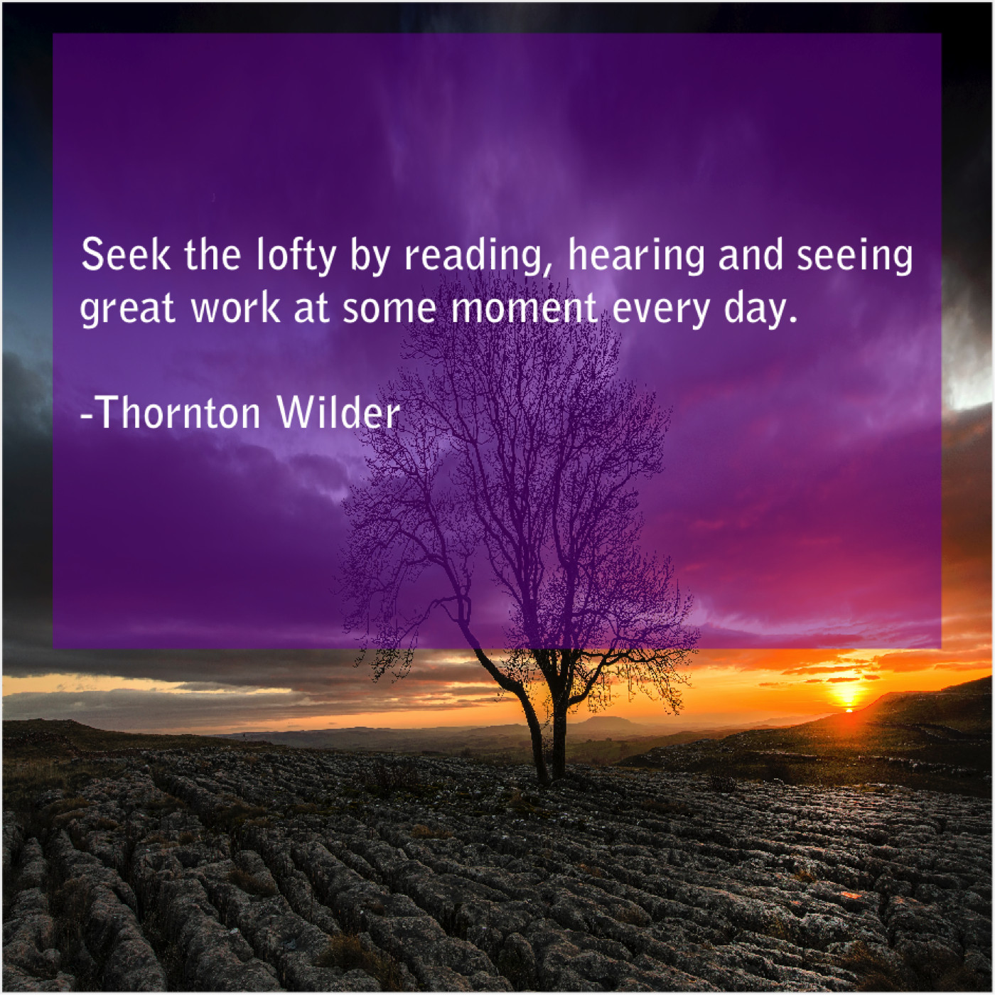 Thornton Wilder Thornton Wilder – Seek the lofty by reading… November 19, 2018 admin “Seek the lofty by reading, hearing and seeing great work at some moment every day.”-Thornton Wilder